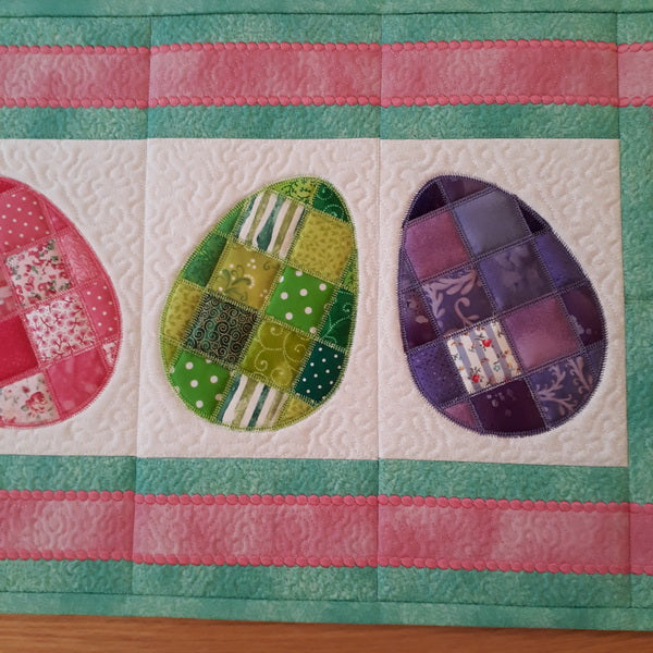 Make this Easy Quilted Easter Table Runner in a weekend! The Egg Panels are made and quilted in the hoop. The border sections are also made and quilted in the hoop. Machine sewing is used to put the panels, borders, backing and binding on. This table runner comes in 3 sizes: 5x7, 6x10 and 7x12