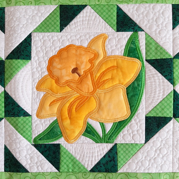 The pieces that make up the daffodil block and first stitched out and quilted on the embroidery machine. They are then joined together with a sewing machine to complete each block. The blocks are then joined and a border and backing are added using a sewing machine.