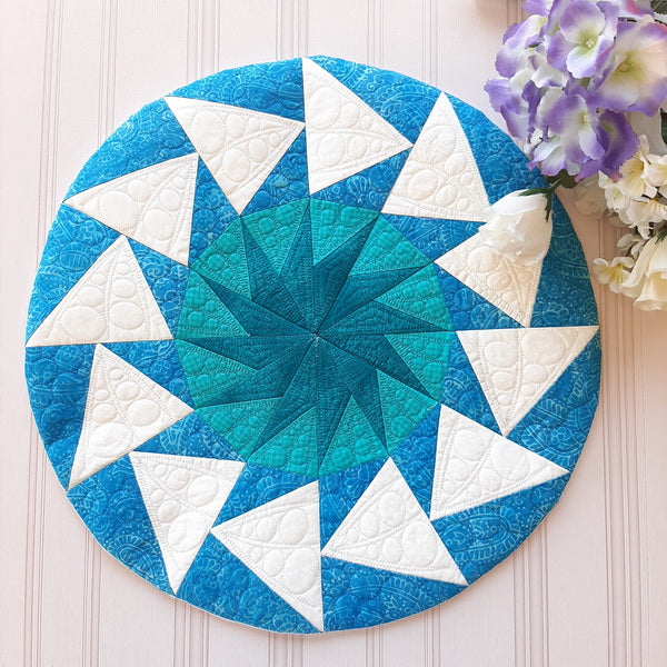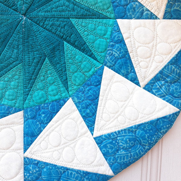 The IHQ Sea Anemone Table Topper is a really quick and easy project to make. Shades of sea green and turquoise are used throughout the quilt, along with the pebble look quilting to give this quilt a sea type theme.