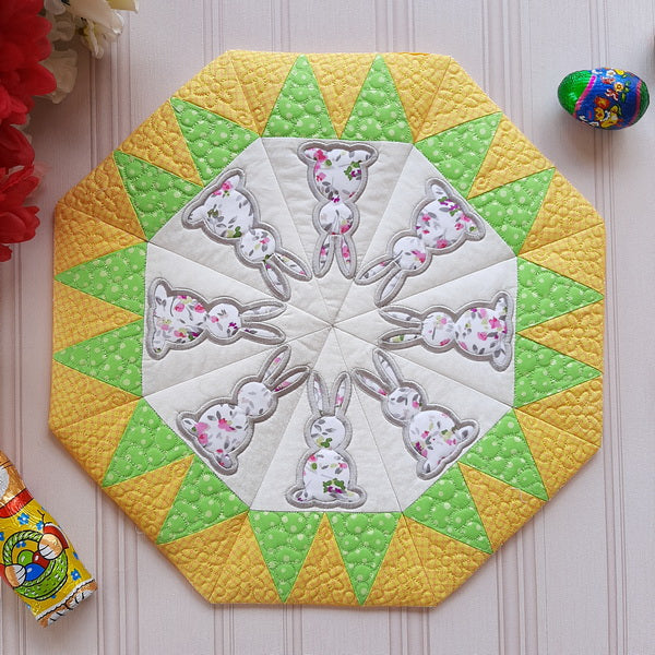 This IHQ Bunny Cookie Crumb Catcher is really easy and quick to make. It is perfect for the Easter table as a center piece or to use as a quilted topper for a vase of flowers or a bowl of Easter eggs.