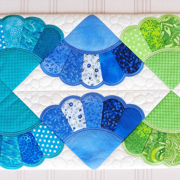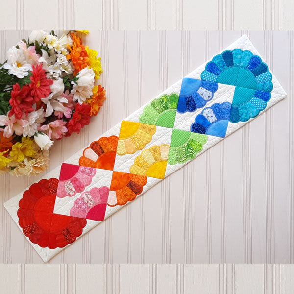 This bright and cheerful IHQ Dresden Table Runner will definitely brighten up your hallway, entrance or living room. This is a fun and easy project to make and you can use up left over pieces of fabric for the petals of the fans.