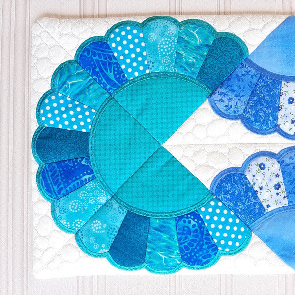 The pieces for the IHQ Dresden Table runner are made and quilted in the hoop. The design has a low stitch count, so it stitches out really quickly. The pebble quilting done around the fans adds to the charm of the design. The fan is done using a combination of the sew and flip method and the applique method.