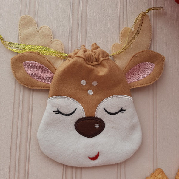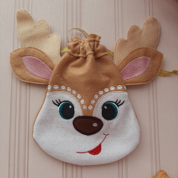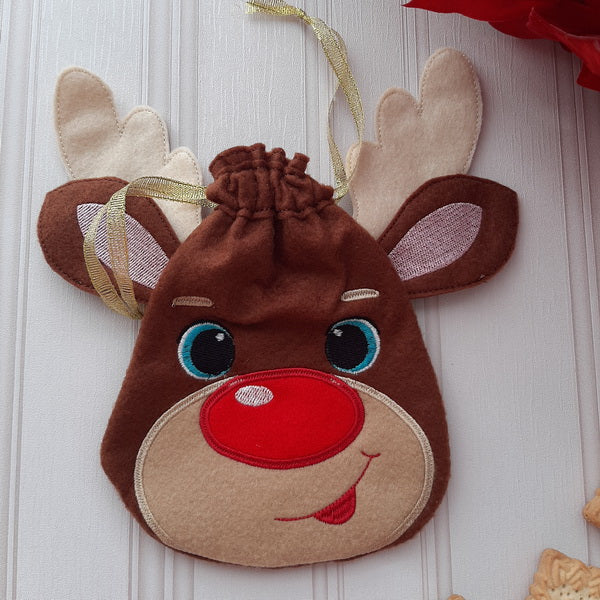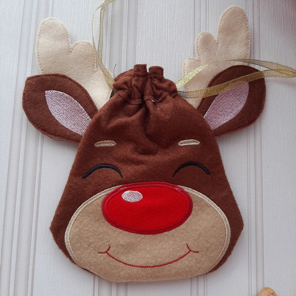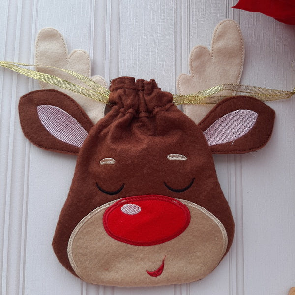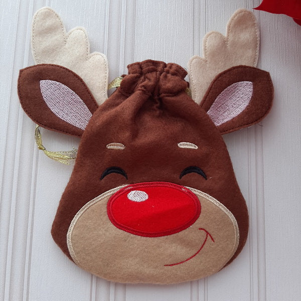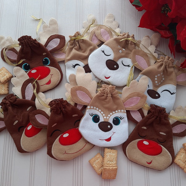 These adorable reindeer drawstring bags are made using the applique method. The pieces are made and embroidered in the hoop. The bags are then finished with a sewing machine. The reindeer bags are made using felt. The antlers, ears and drawstring gusset are done as a raw edge applique.