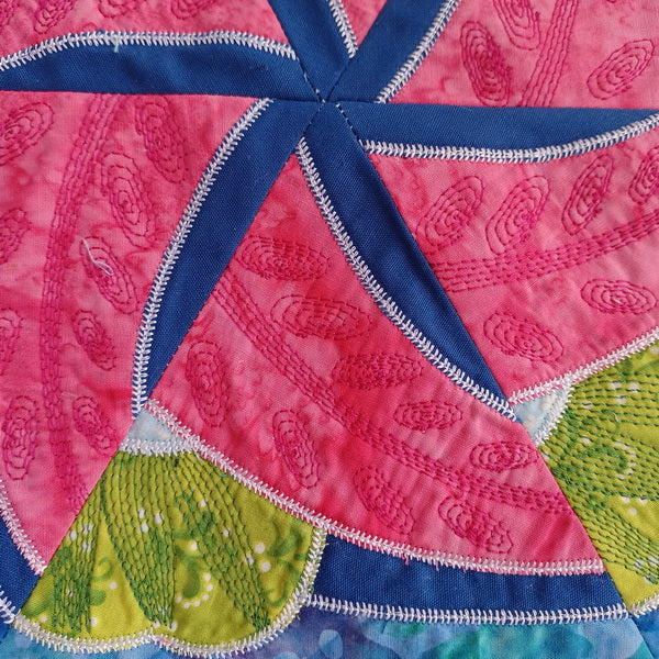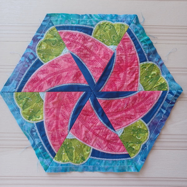 The Kaleidoscope Fantasy Hexagon Block 2 is the second hexagon block of our “Block A Week” embroidery-quilting project. There are 8 hexagon blocks to collect that make up the Kaleidoscope Fantasy Quilt.
