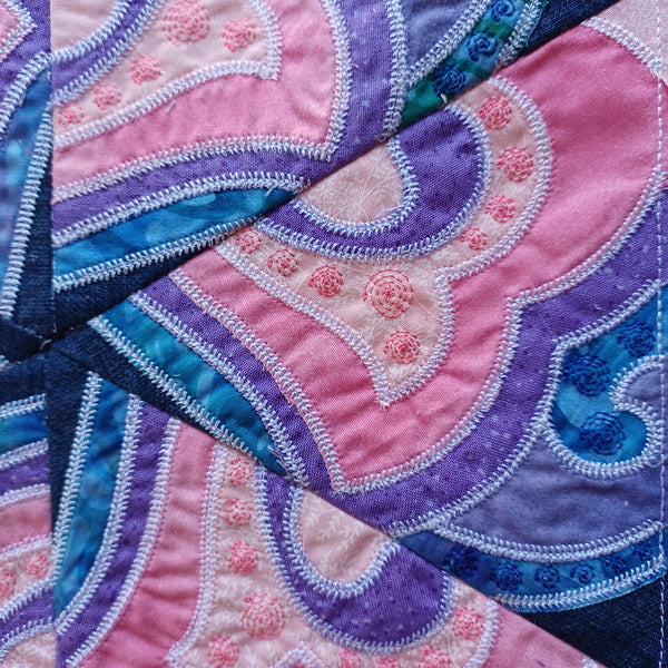 The Kaleidoscope Fantasy Hexagon Block 6 is the sixth hexagon block of our “Block A Week” embroidery-quilting project. There are 8 hexagon blocks to collect that make up the Kaleidoscope Fantasy Quilt.
