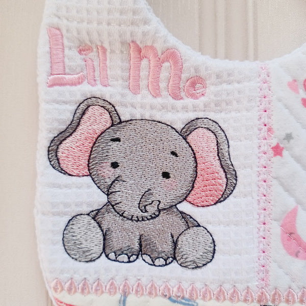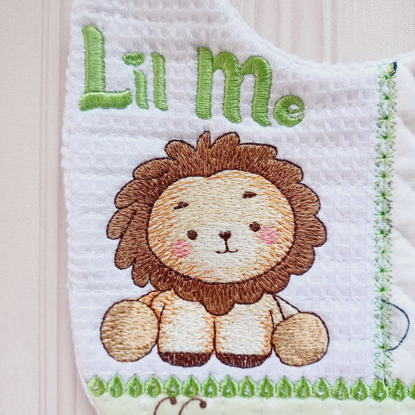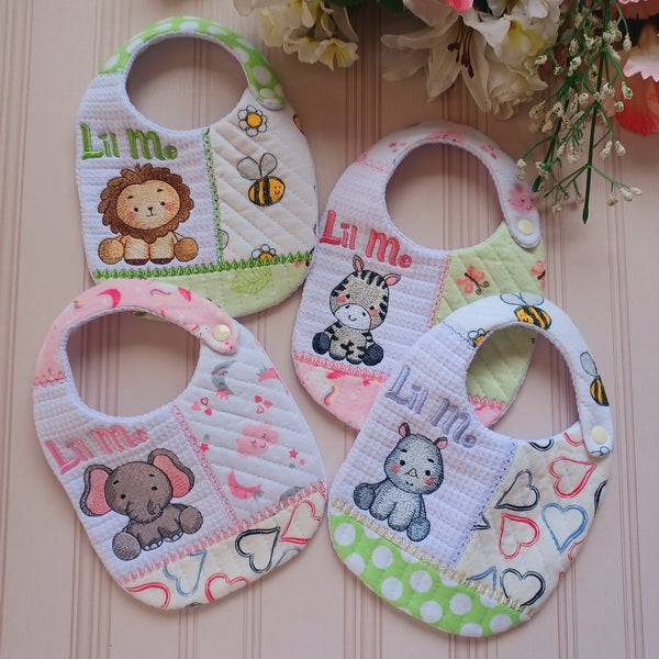 There are four adorable baby animal bibs to make. A blank panel is also included in this design set, so you can personalize with wording or a design of your own.