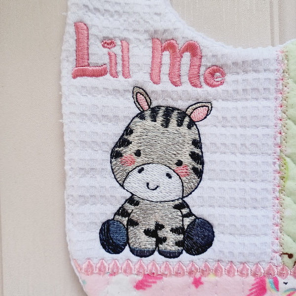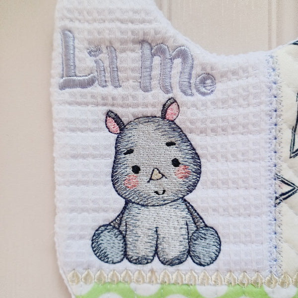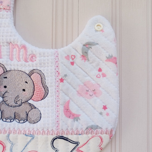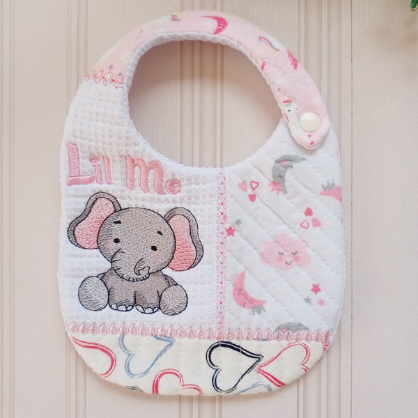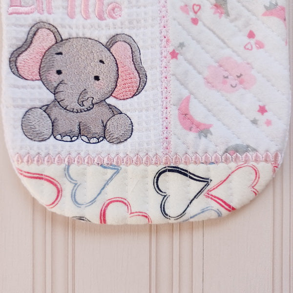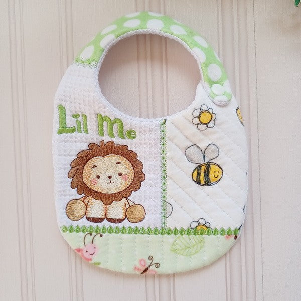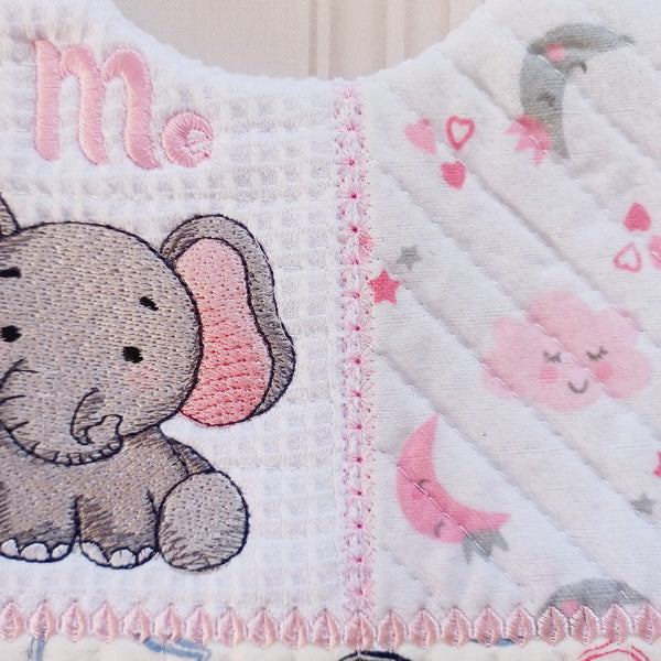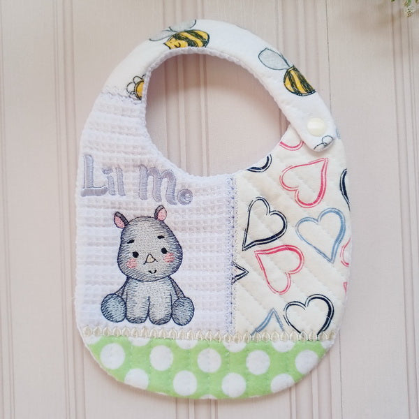 These ITH Quilted Baby Animal Bibs are quick and easy to make. The front of the bib is quilted and made in the hoop. To finish the bib, a backing fabric is sewn on using your sewing machine. A little hand stitching is used to close the opening from when the backing was added.