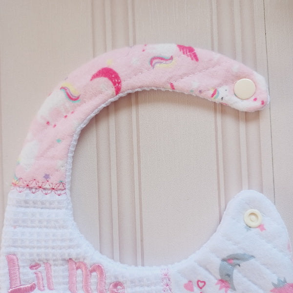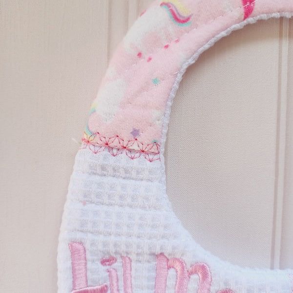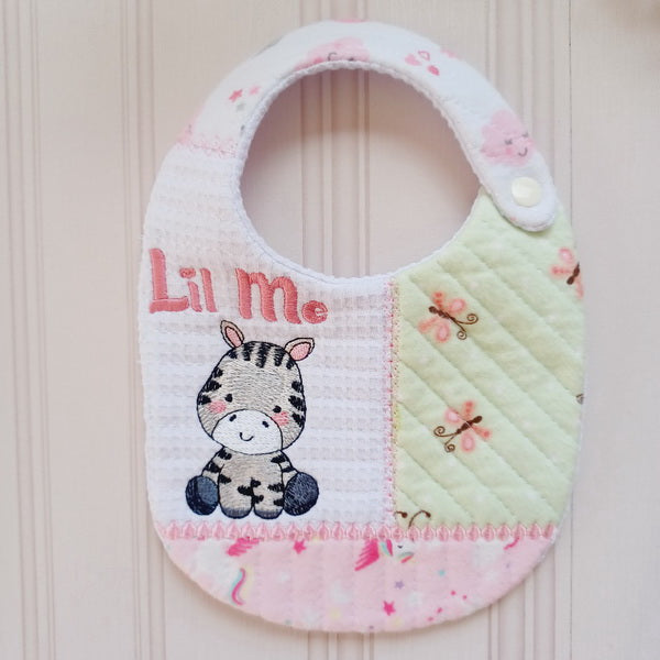 The front of the bib is made up of 4 panels. The panels are joined together in the hoop and each panel is quilted at the same time. There are no raw edges and a decorative stitch joins the panels together. Each panel fits the 5x7 hoop, so a large bib is made using a smaller hoop. A different fabric is used for each panel, making each bib a color block bib. It is a fun way to use up smaller, left over pieces of fabric. Have fun mixing up your fabrics to create unique color block bibs.
