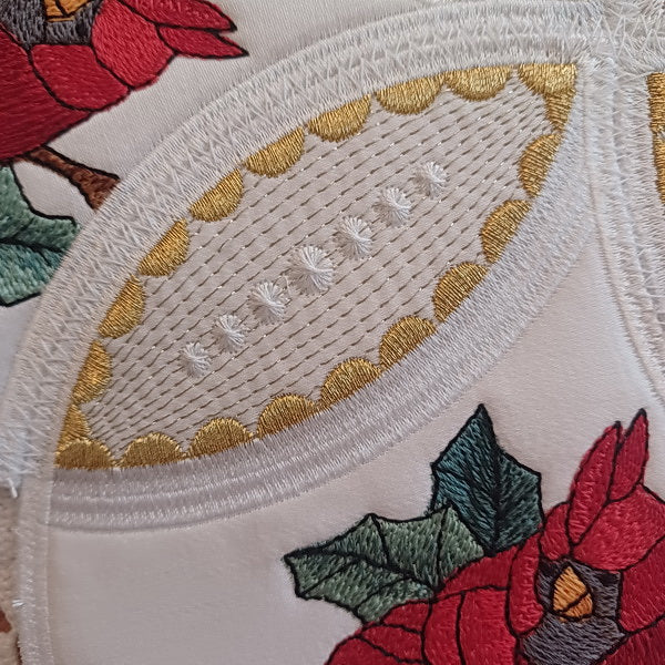 The cardinal and leaves are harmoniously shaded and textured. The pieces are entirely made and fully lined in the hoop and then sewn together with a sewing machine.