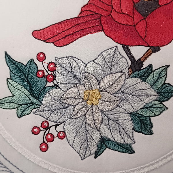 The winter cardinal and poinsettia are artfully digitized in harmonious shadings, creating an eye-catching focal point. The intricate wintery frame adds depth and dimension to the design, with three thread shades creating a stunning visual effect.
