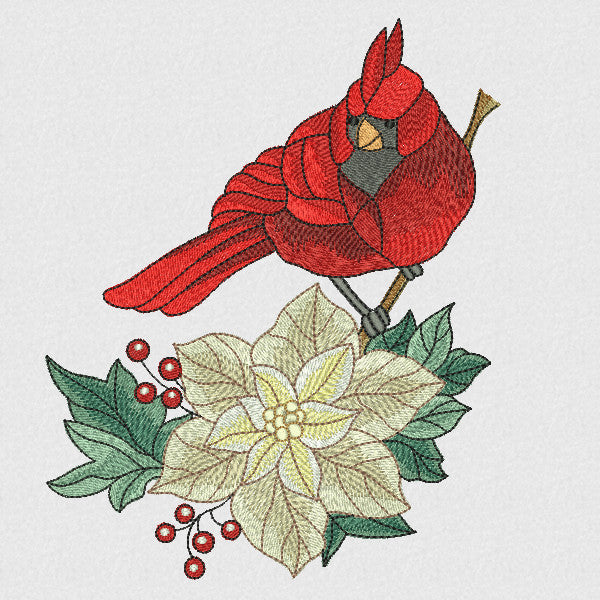 Introducing the Winter Cardinal with white poinsettia! This exquisite machine embroidery design captures the essence of winter and Christmas.
