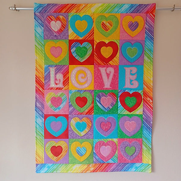 The Hearts Love Quilt is a super easy quilt to make. Done in applique and stipple quilting, each block stitches out really quickly, making this a fun project to make. You can make any size quilt with these blocks.