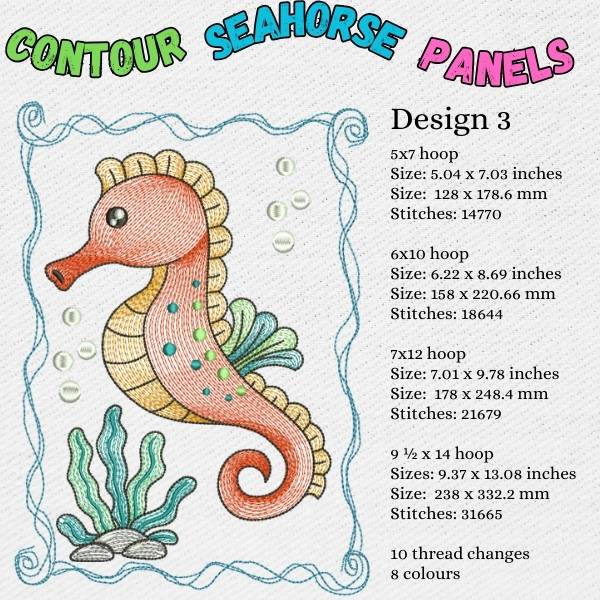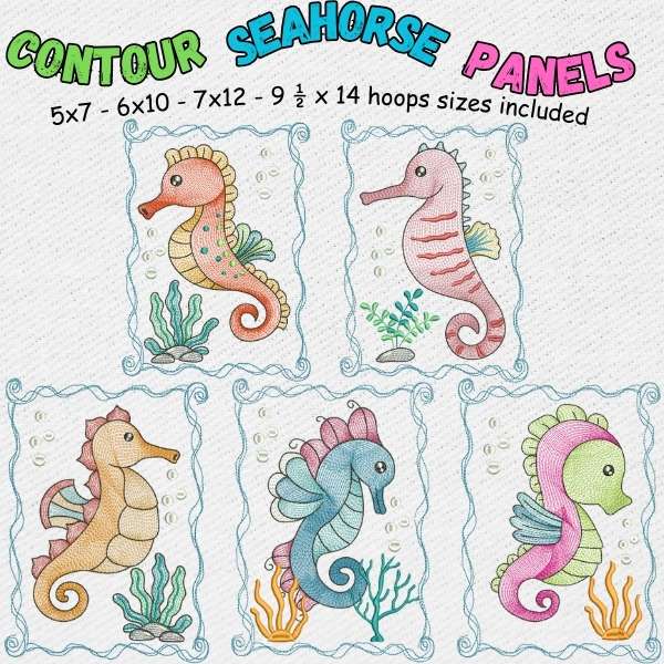 There are 5 Contour Seahorse Panels in 4 different hoop sizes giving you a total of 20 embroidery designs.