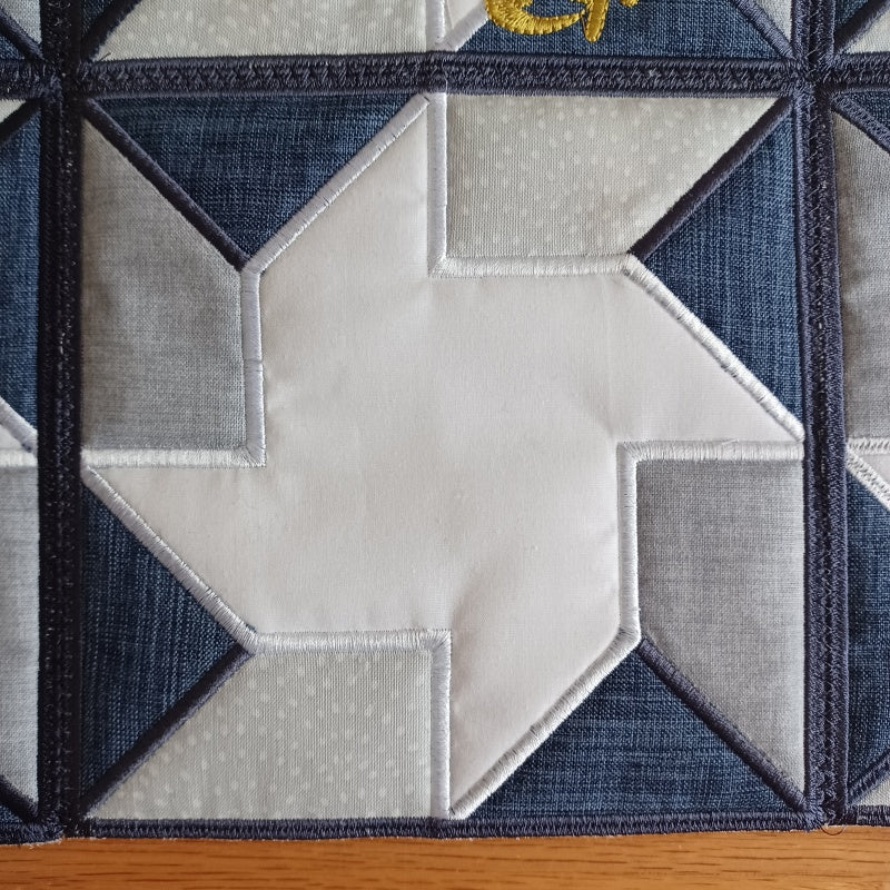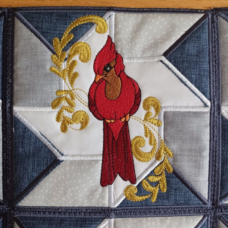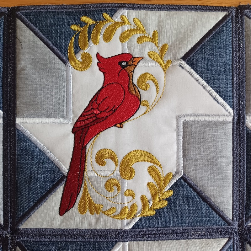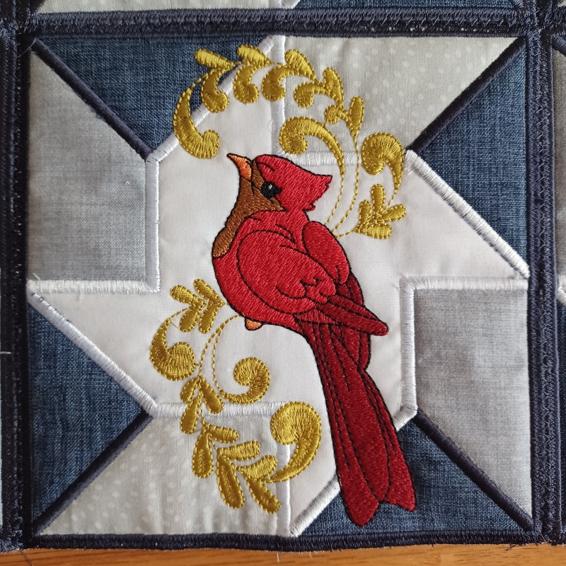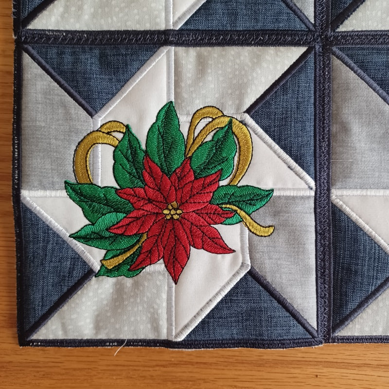 The poinsettia and the birds are harmoniously shaded and textured. The block is done using the applique method. The blocks are entirely made and fully lined in the hoop and then sewn together with a sewing machine.