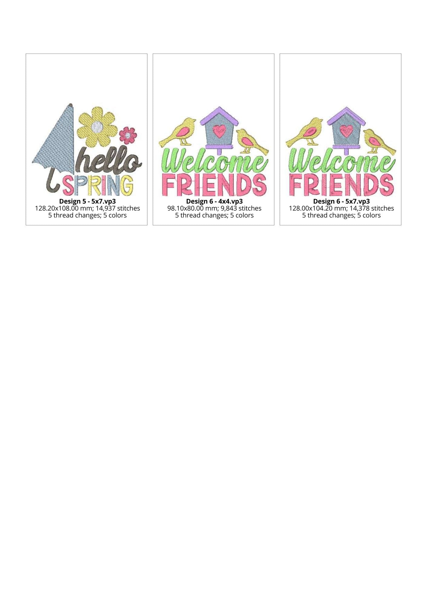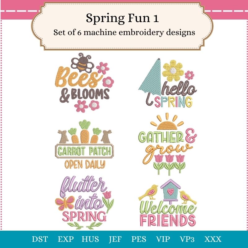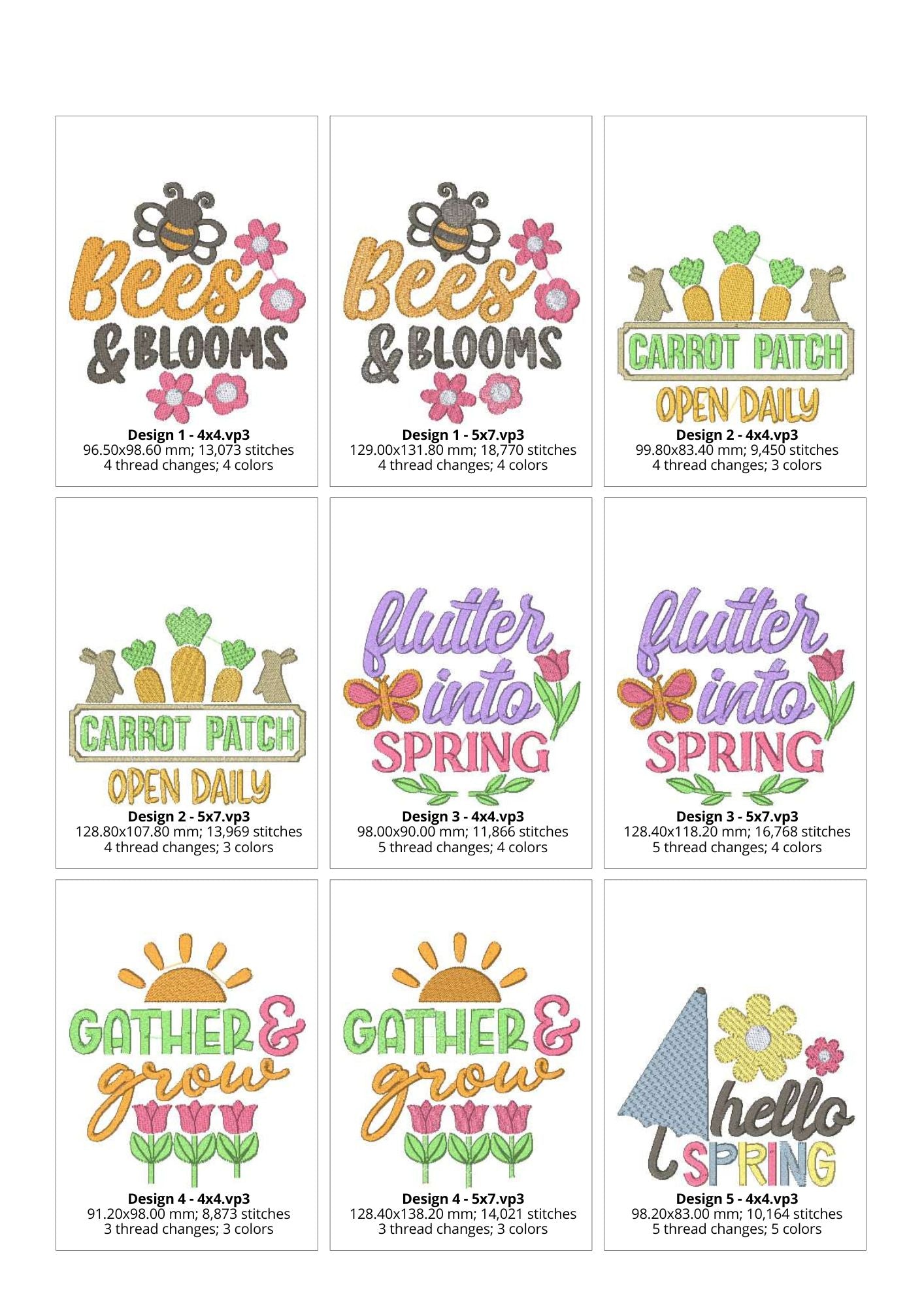 Fun set of 6 spring machine embroidery designs. Ideal for your next seasonal project. Each design comes in 2 sizes: 4x4, 5x7