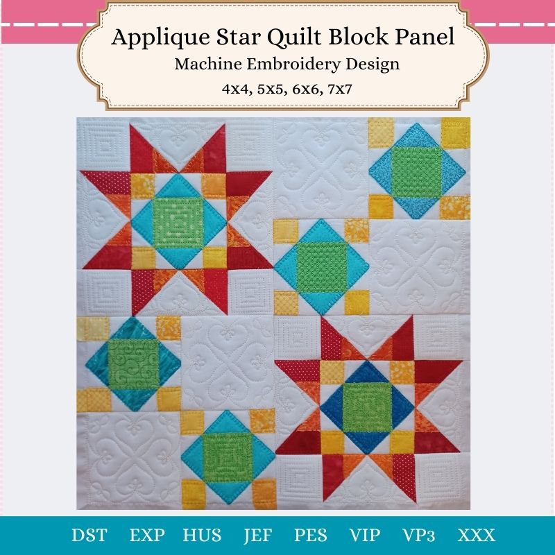 Make beautiful applique star quilt blocks or panels with these easy to create designs. ย Each block is made and quilted in the hoop. ย The fabrics are added to each block using the applique method.ย