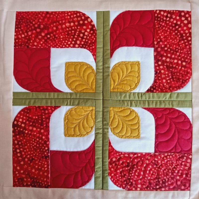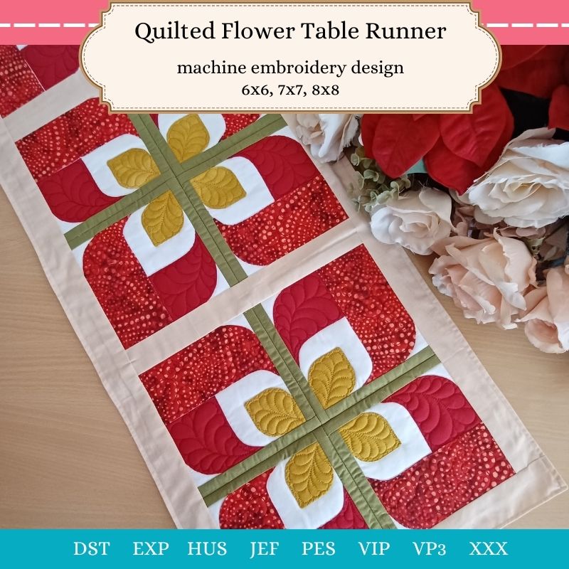 The Quilted Flower Table Runner is a fun project to make. Using the turn and sew applique method, there are no raw edges and there is no satin stitch edgings. This design has a low stitch count, making it quick to stitch each block. This applique method give the design an heirloom feel. An invisible nylon thread and a specially designed tack down stitch is used to stitch the applique pieces. This gives a more traditional feel to the flower panels. Each flower panel is made up of 4 blocks. Each block is made and quilted entirely in the hoop. The applique pieces are also done in the hoop, making the fabric preparation easy.