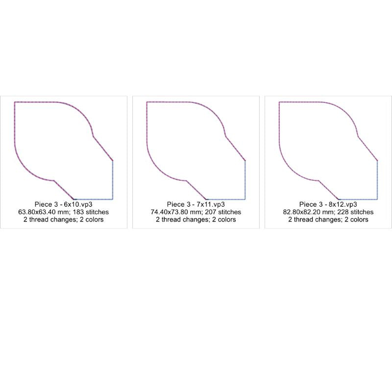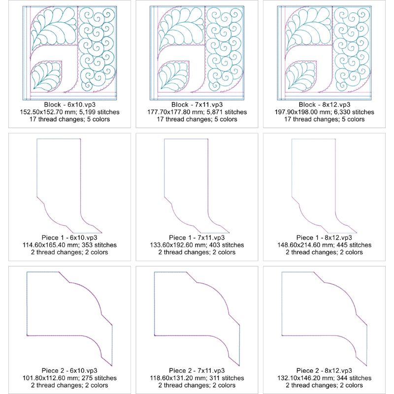 This design comes in 3 sizes: 6x10 (6x6 block), 7x11 (7x7 block) and 8x12 (8x8 block) - these hoop sizes are needed to make the applique pieces.