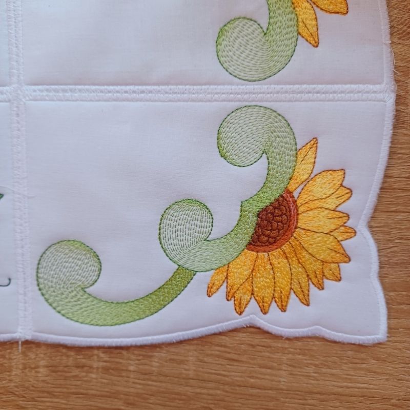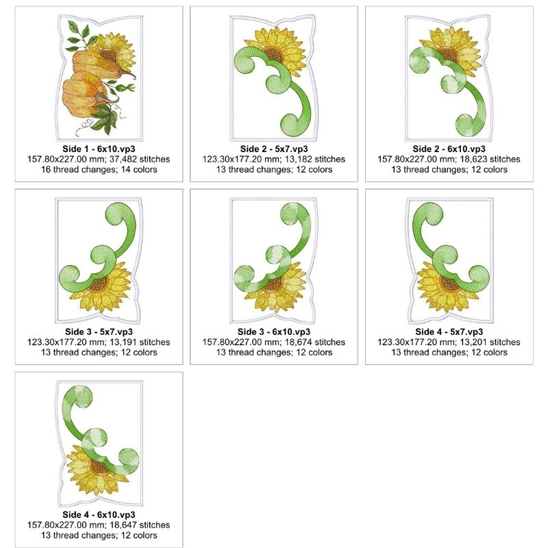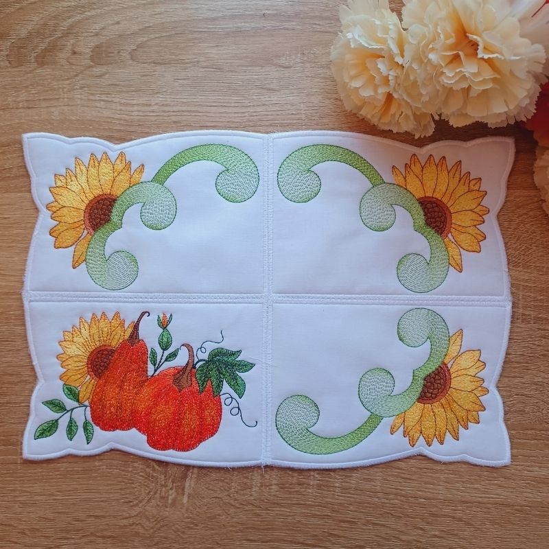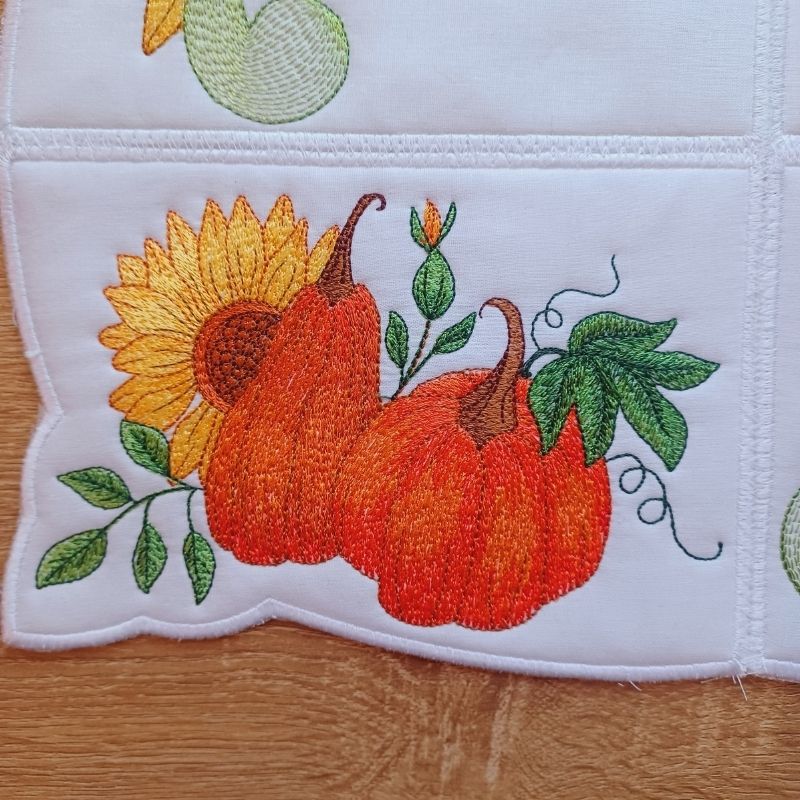 Make this lovely Harvest Time Topper for your favourite table. It can be also be used for a tray cloth or placemat. This design comes in two sizes: 5x7 and 6x10. Each piece is made and lined entirely in the hoop. Use a sewing machine to join the pieces together.