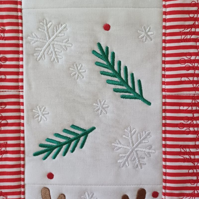 Make this fun ITH Reindeer Table Runner for Christmas. Each panel is made entirely in the hoop. The reindeer is done in applique. The border pieces are quilted in the hoop. This table runner has 4 center panels and a quilted border.