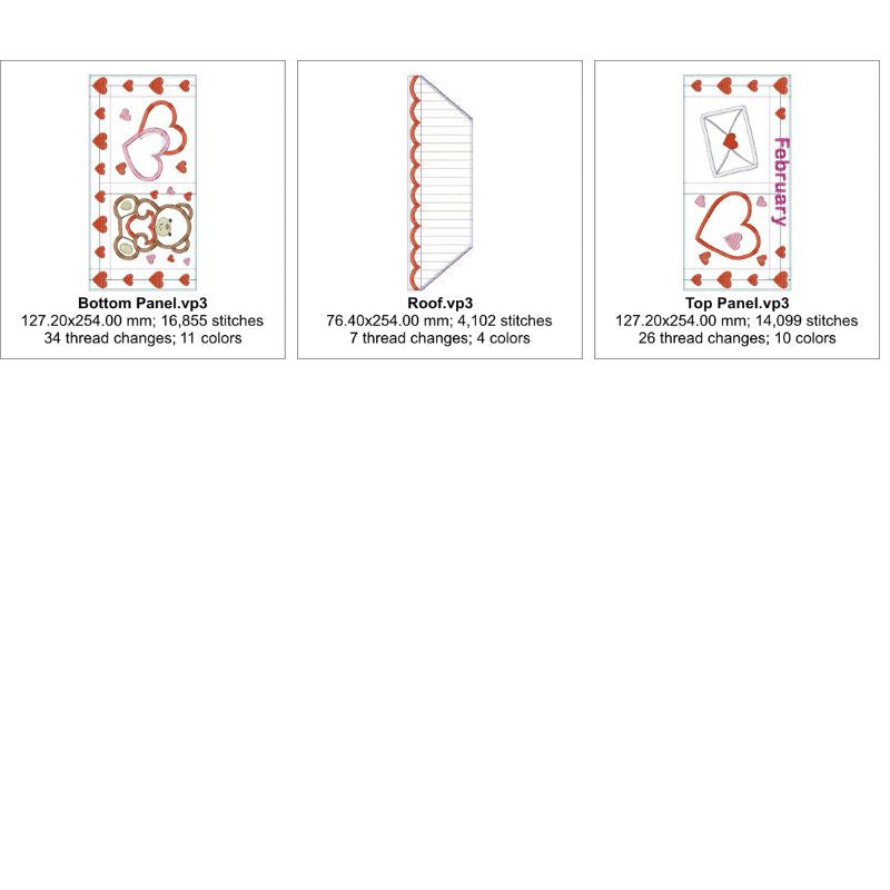 This adorable February themed ITH house mini quilt is made in 3 hoopings. Each panel is made in the hoop. The panels and final completion is done using a sewing machine.