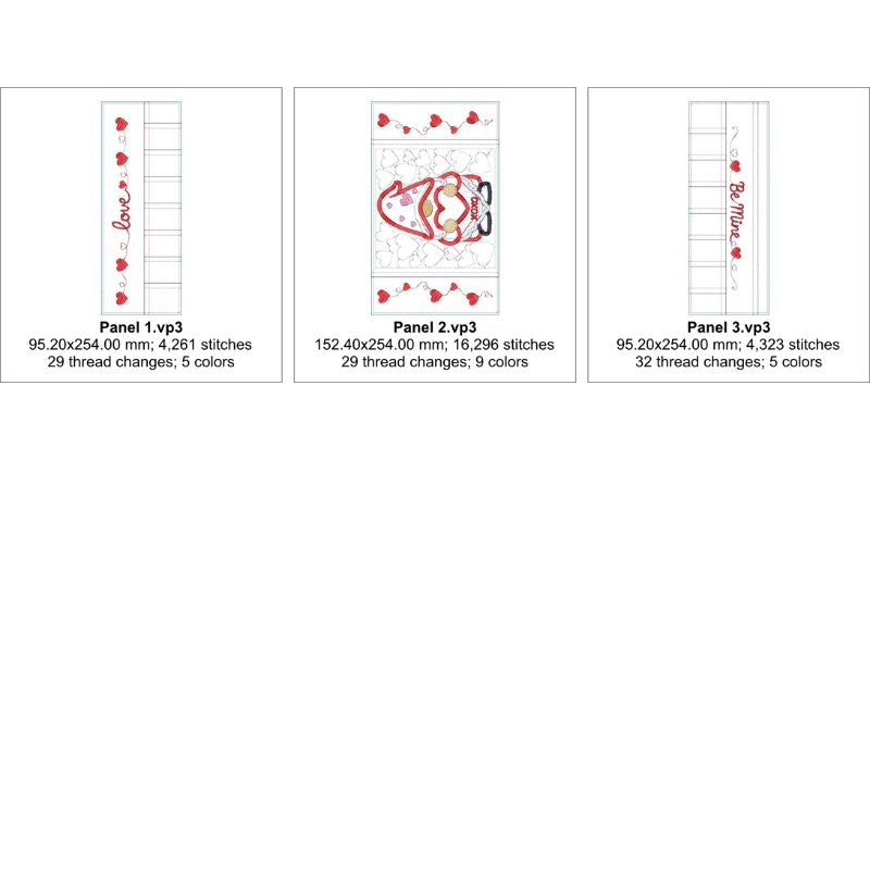 This super cute Valentines Mini Quilt is made using applique and the sew and flip technique. Each panel is made entirely in the hoop. The panels are joined and the mini quilt is completed using a sewing machine.