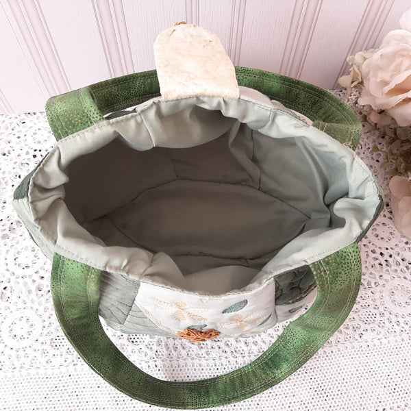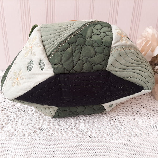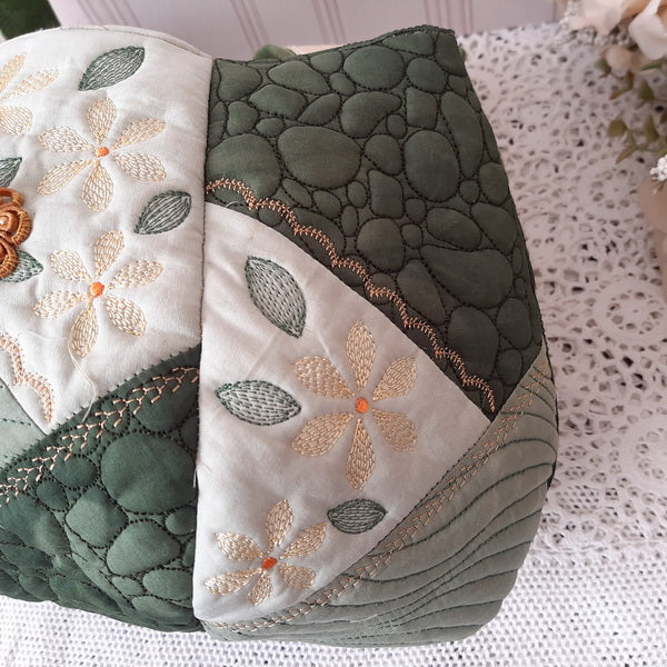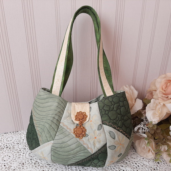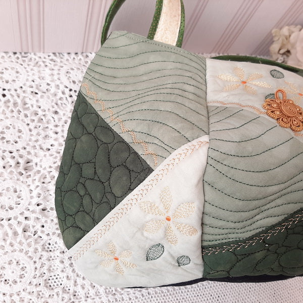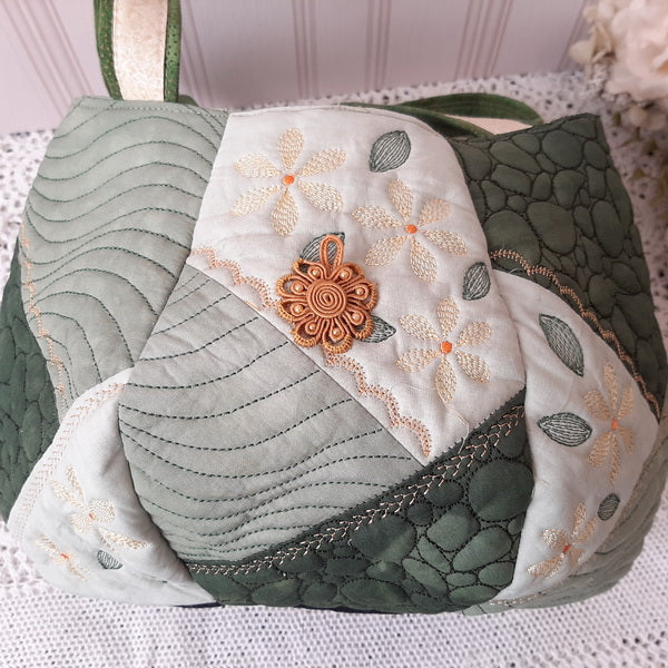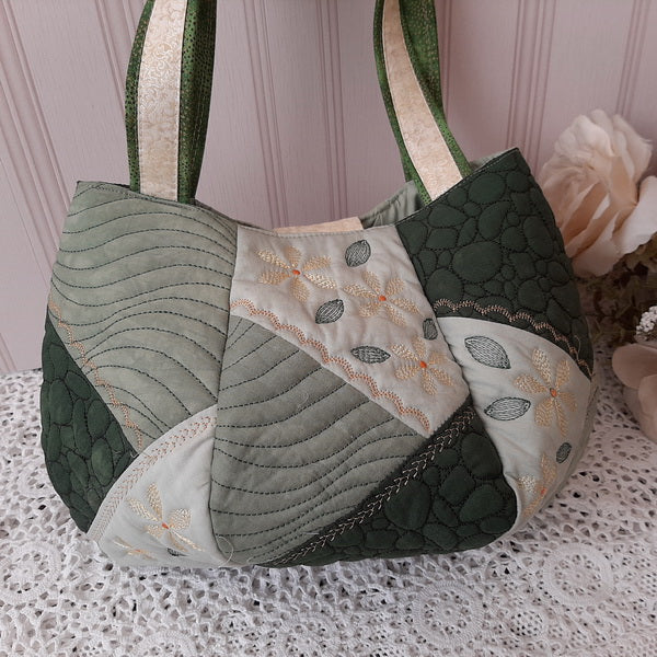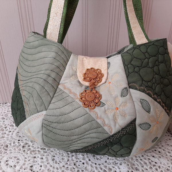 The IHQ Crazy Patch Bag has 6 panels and a base, each of which is quilted, embroidered and completed in the 6”x10” Hoop.