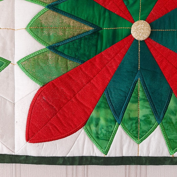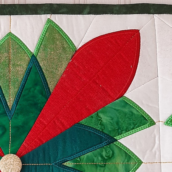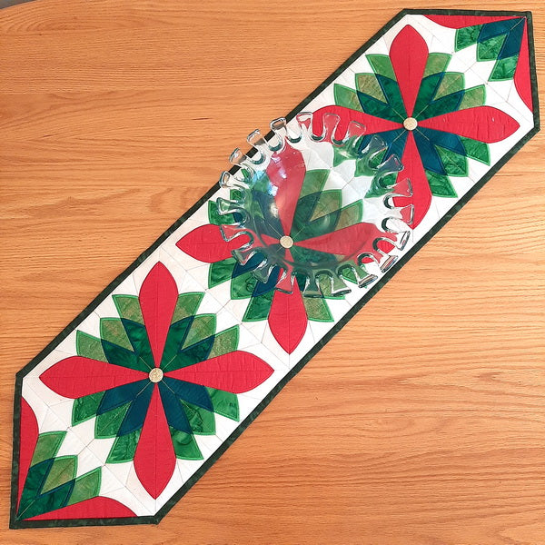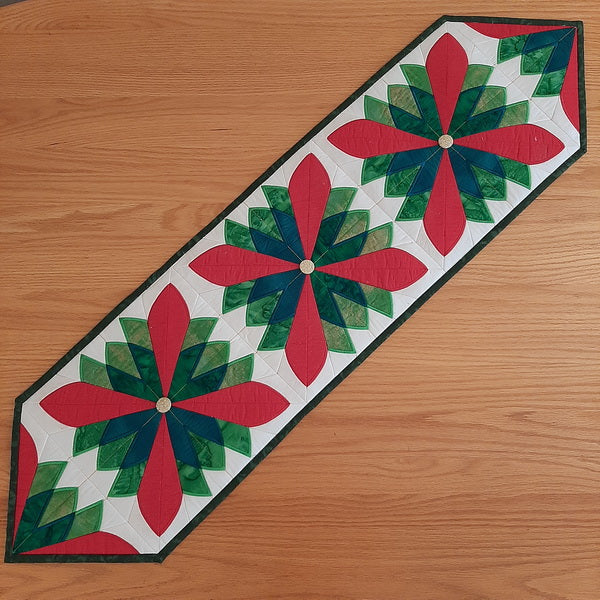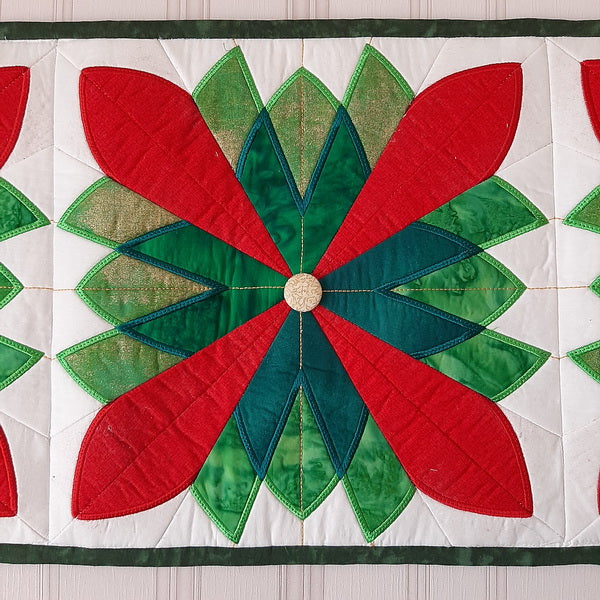 This Christmas Fan Table Runner is a lovely addition for your Christmas table and home. We used various shades of dark green and light green fabrics to create an interesting effect on the Christmas Fan Table Runner. Play with shades of fabric to create your own unique table runner. Change out the colours of fabric to match your home decor and make matching cushions, placemats, wall quilts or even a bed footer. The many various quilted projects you can make using this design are endless!