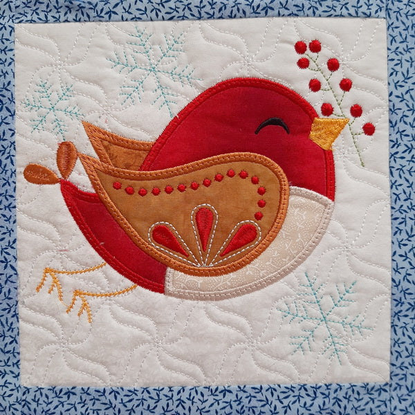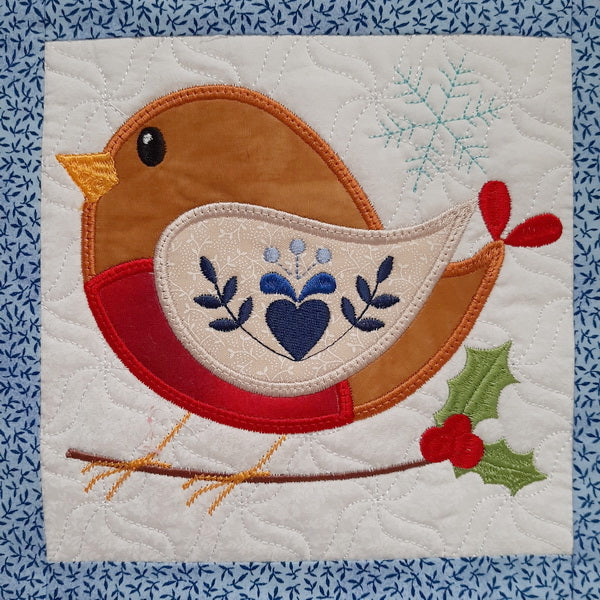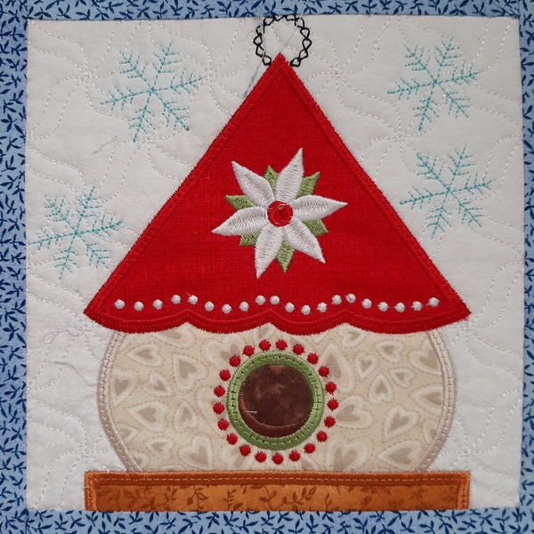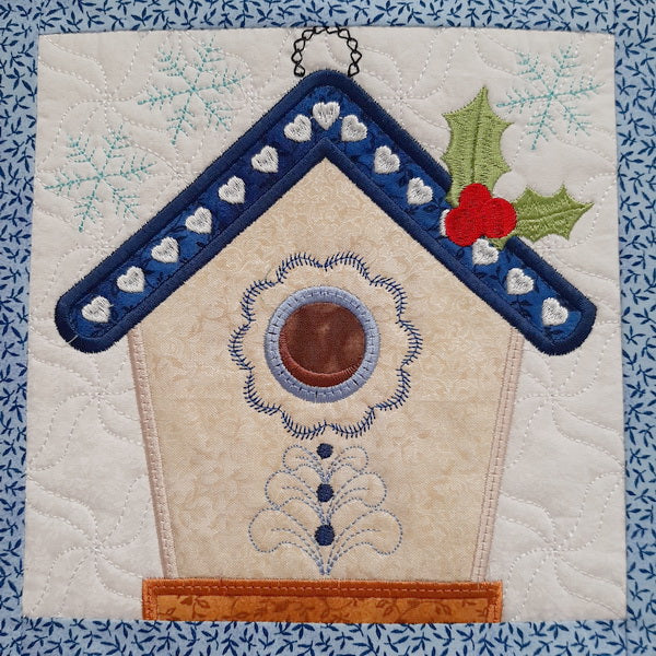 This Christmas Robins and Birdhouses hanger brings wintery charm to any wall. It is an easy project to make and is perfect for a quilting weekend. Each block is quilted in the hoop and the adorable Christmas robins and birdhouses are done with applique.