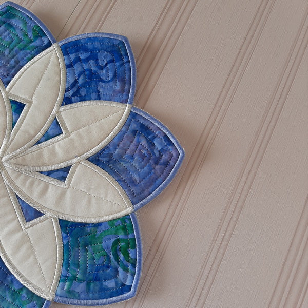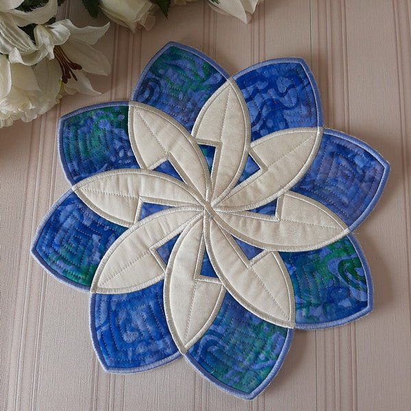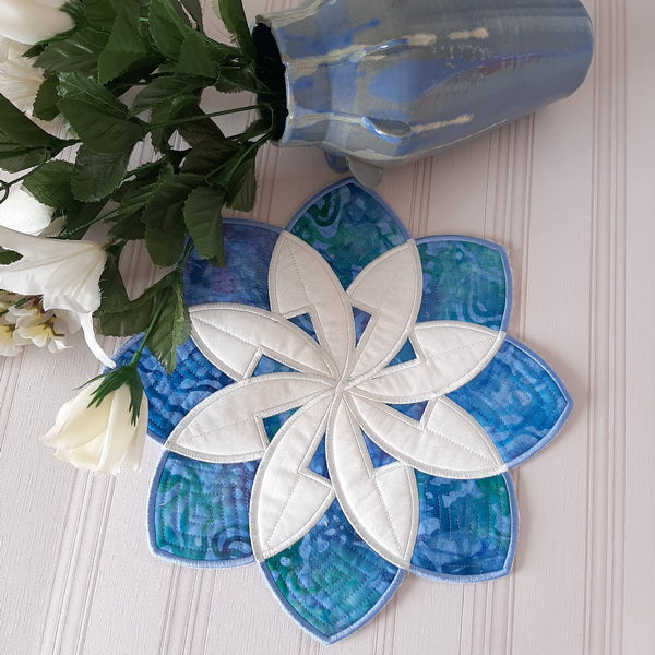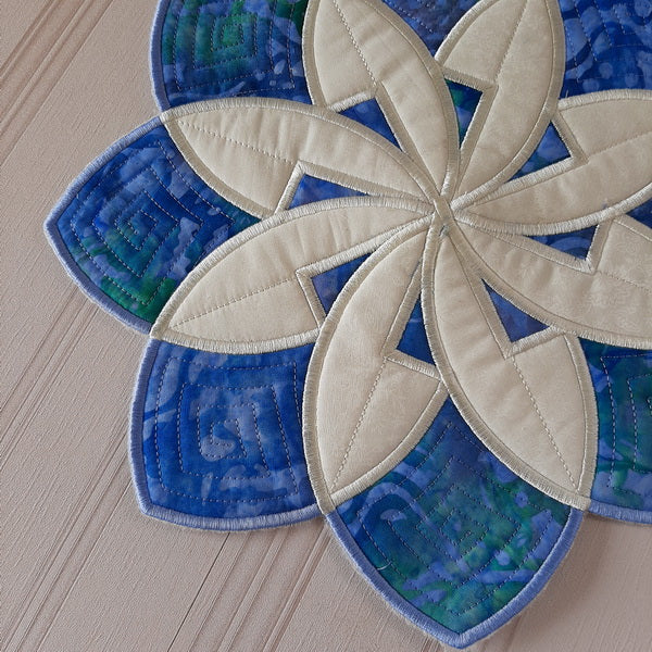 The ITH Large Applique Spring Table Topper 1 comes in 3 Hoop sizes: 5” x 7”; 6” x 10” and 7” x 12”. There are 8 pieces to make up the ITH Large Applique Spring Table Centre. The Applique Method is used for applying the fabric, each piece is quilted, lined and joined In The Hoop. There is no additional sewing required - the ITH Large Applique Spring Table Centre 1 is made and completed in an embroidery machine.