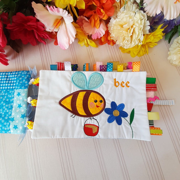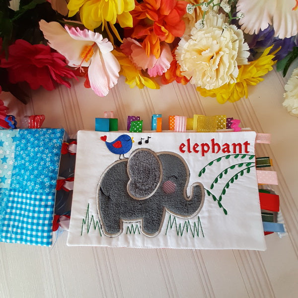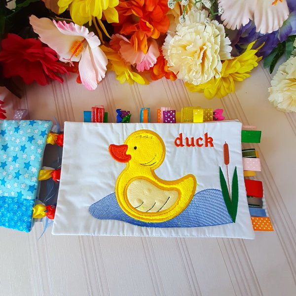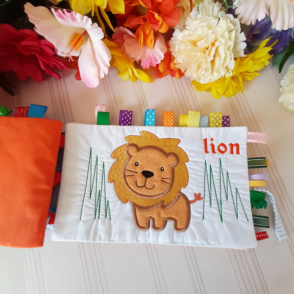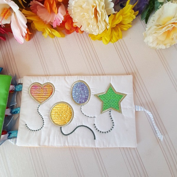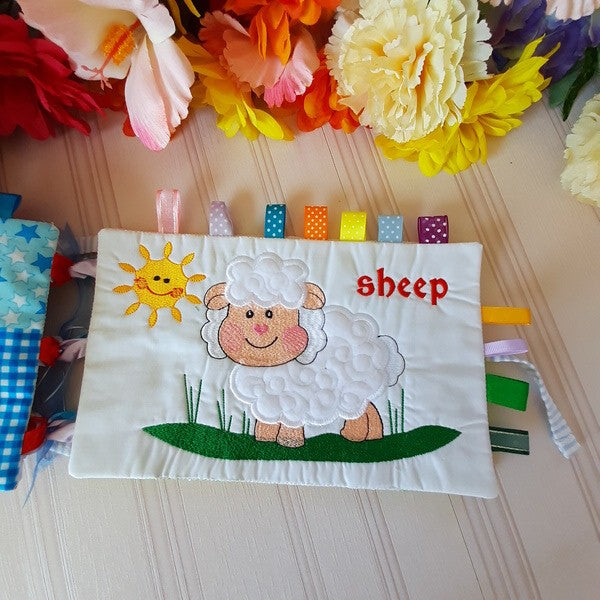 This is an In The Hoop Sensory Quiet Book for babies and toddlers. The ITH My Quiet Book 1 has various textured pictures which are done in applique with lots of colourful embroidery. All the pages are lined for neatness and the animal pages have ribbon taggies which babies love.
