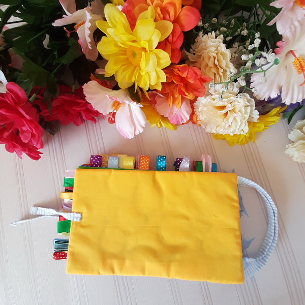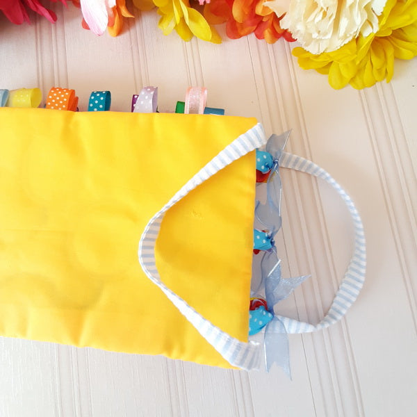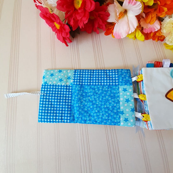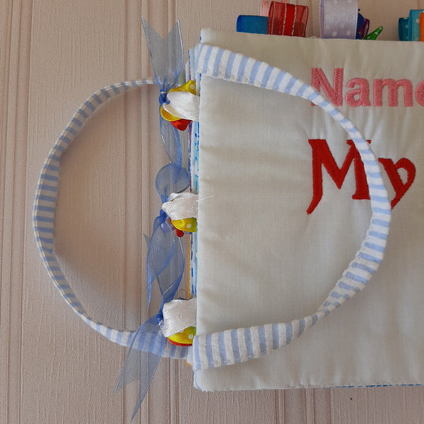 The ITH My Quiet Book 1 has Front and Back Cover pages and 5 picture pages. There are 2 handles on the book making it easy for a child to carry. The book ties keep the book closed. Little ribbon ties threaded through ribbon loops under the handles hold the book together.