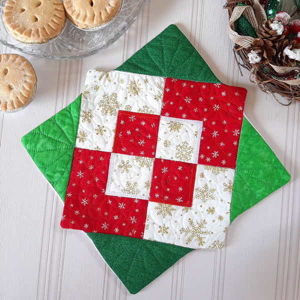 The Christmas Corners Quilted Table Topper is a very easy and quick project to make. This project can be made in 3 different sizes. You can use it as a Placemat, a Cookie Crumb Catcher or a Table Topper!