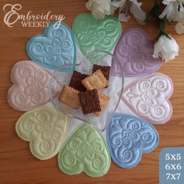 The Applique Heart Table Topper comes in 3 Hoop sizes: 5”x5”; 6”x6” and 7”x7”. It is made in 4 hoopings which are stitched together on a sewing machine. Each piece is completed (including the backing) In The Hoop.