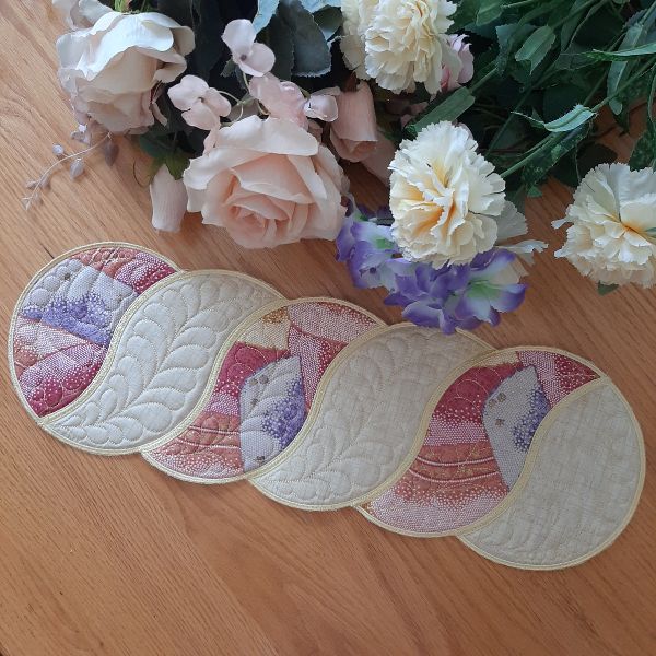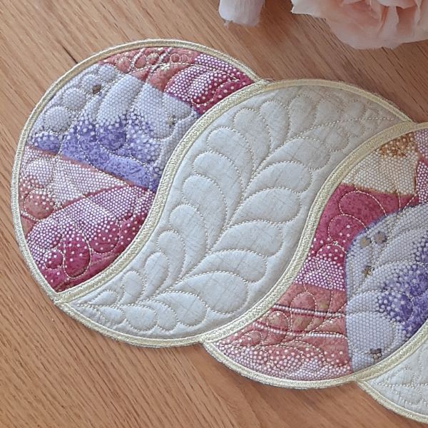 This is a very versatile design as it can be made in a variety of sizes. Besides a table runner of whatever length required, the pieces can also be arranged differently to make a round mat or doily (using only the end pieces), a mug rug, coaster or a placemat.