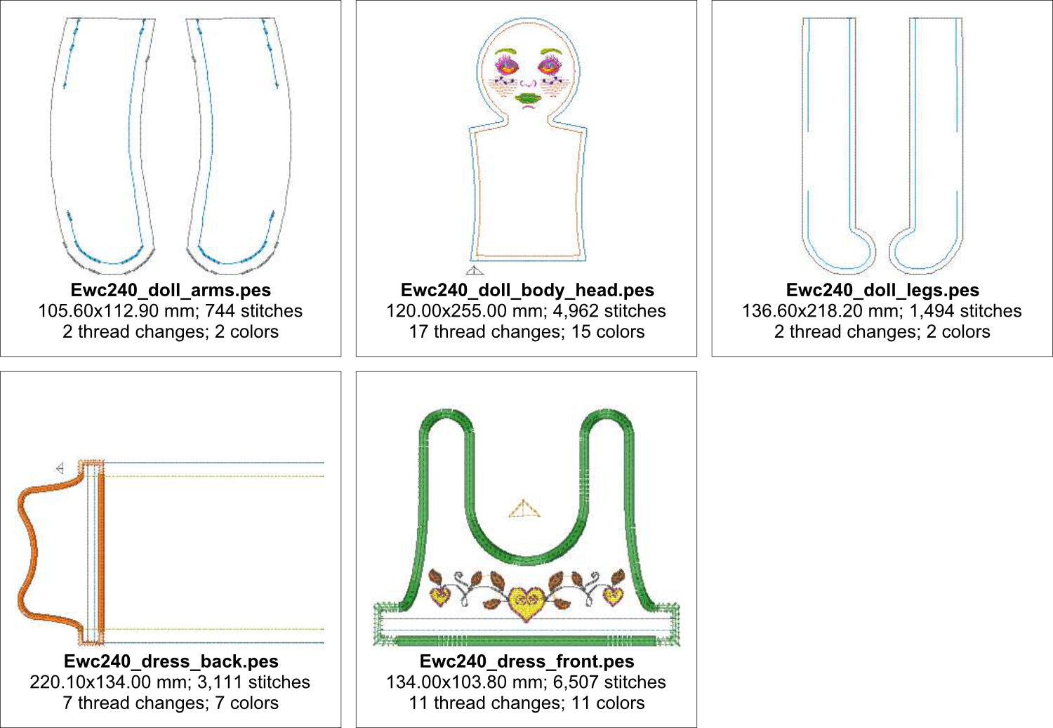 The Ginger-Mary doll is made ITH on an embroidery machine. A little hand-sewing is needed to close the body openings after stuffing.