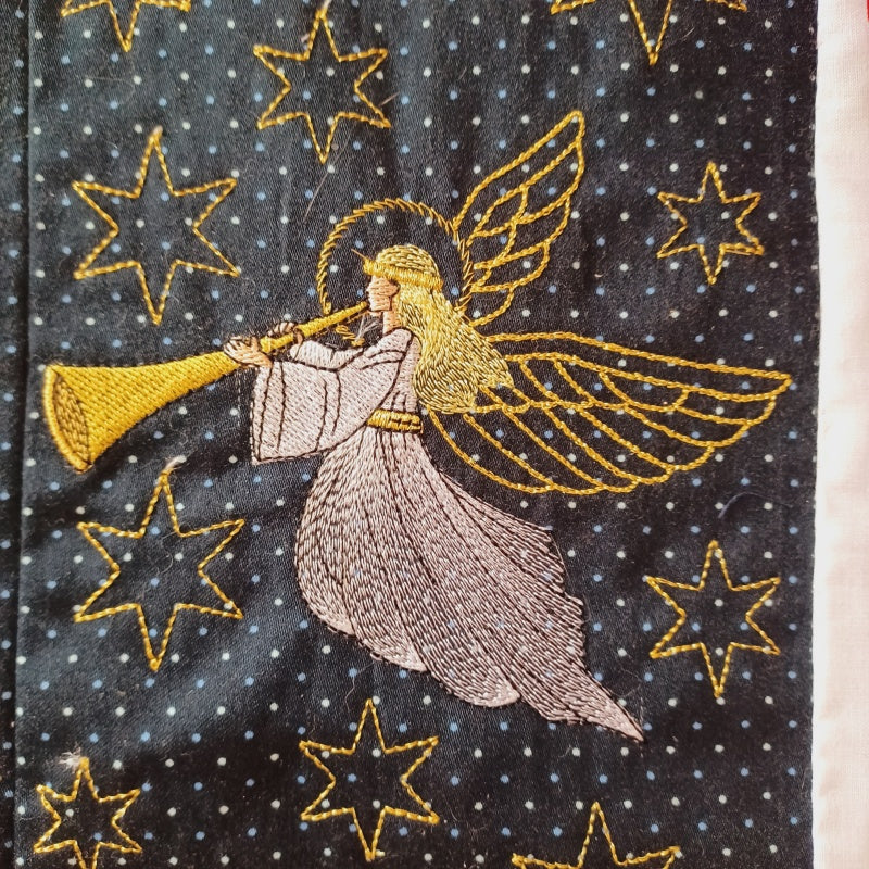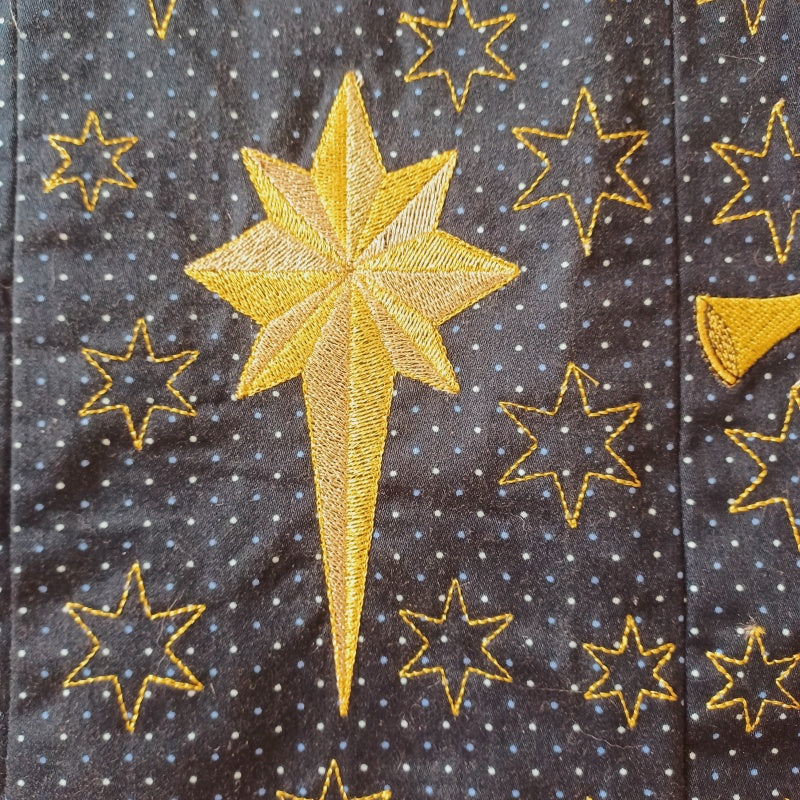 The design pieces for the Nativity Hanger are done for the 6inch by 10inch hoop. The Nativity Hanger is made up of 10 design pieces. Each design piece is made in the hoop. The pieces are then stitched together on a sewing machine. The self-binding method is used for the backing and binding of the Nativity Hanger.