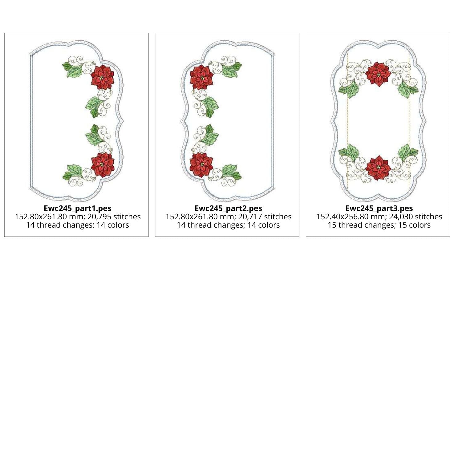 The finished size of the ITH Festive Table Mat is 15.5 inches wide x 10 inches high