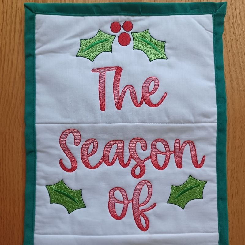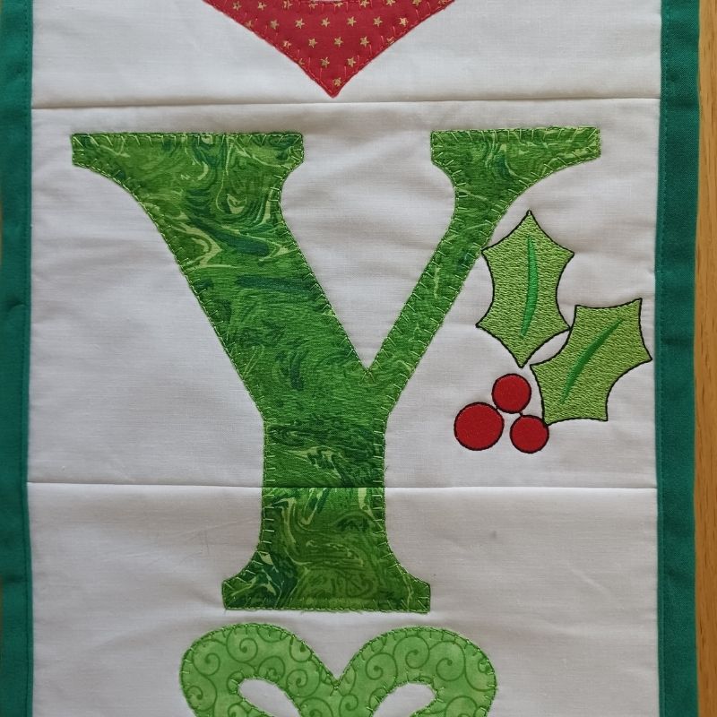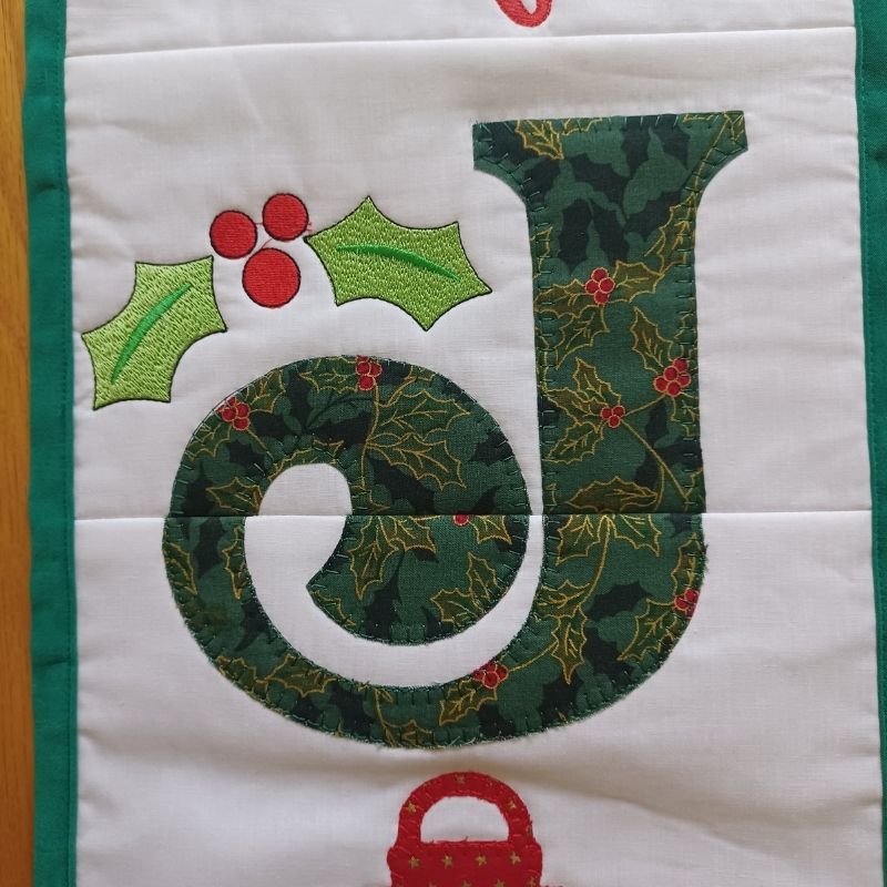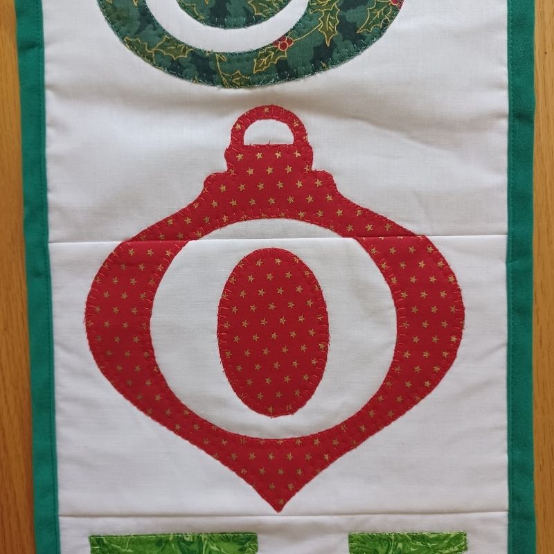 Welcome family and friends with this Joy Hanger. Hang it on your front door, in your entrance way or in your living room. It will sure add to the Christmas cheer. Panels are made in the hoop. The applique method is super quick and easy to do with everything trimmed ITH. You will have your hanger ready in no time. The panels are joined together and the backing and binding is done with a sewing machine.