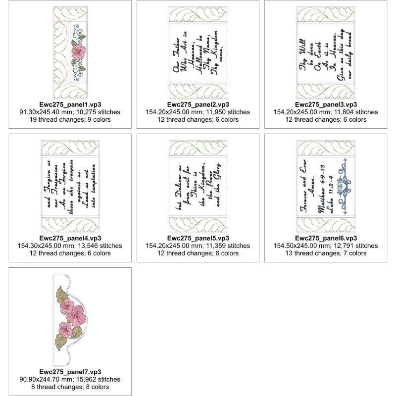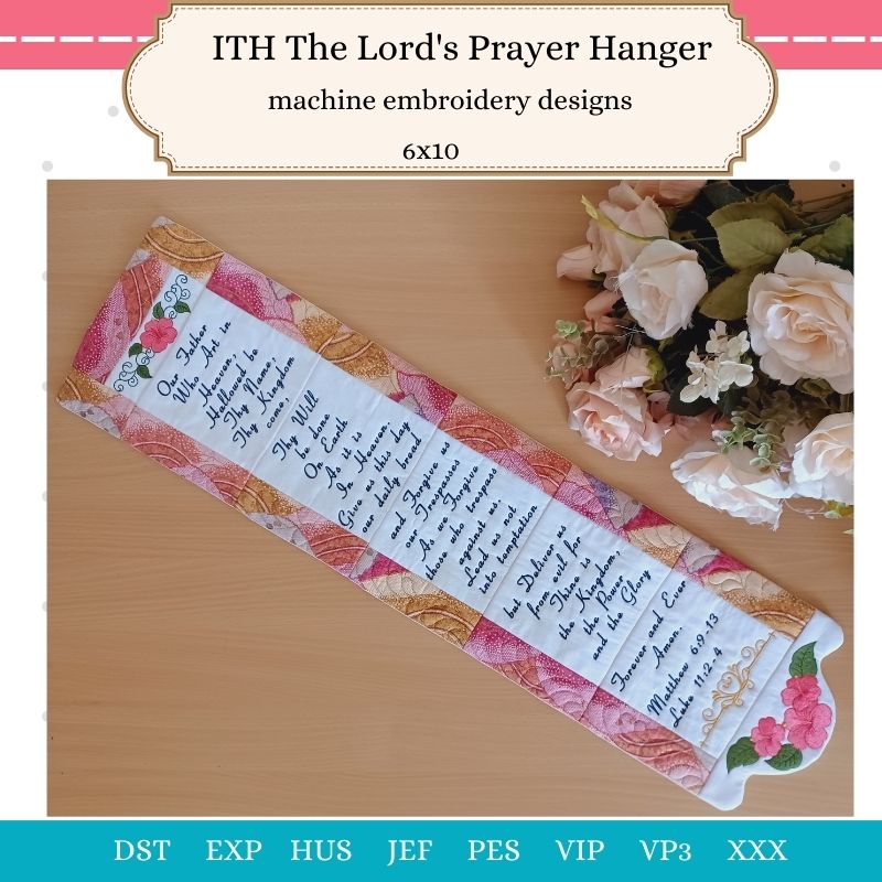 The ITH Lord’s Prayer Hanger would be a lovely addition to a Sunday School classroom, school-room or a child’s bedroom. Each design piece is made, framed and embroidered In The Hoop. The finished design pieces are stitched together on a sewing machine using a running stitch. The backing fabric is also added by sewing machine.