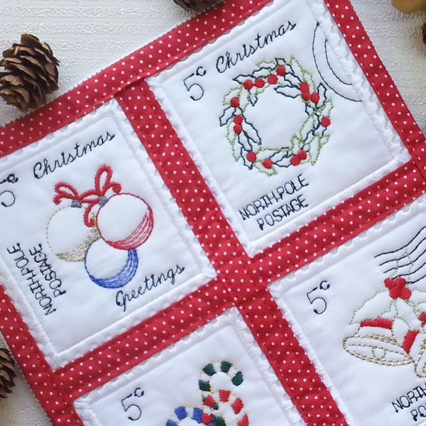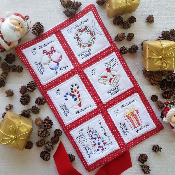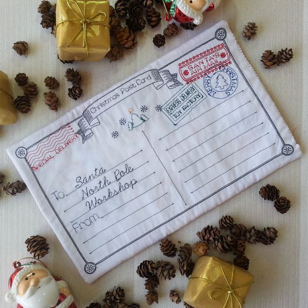 Send your Christmas requests to Santa with this In The Hoop Post Card Mini Quilt. It is made in two straight forward hoopings. This design is for the 7x11 hoop.