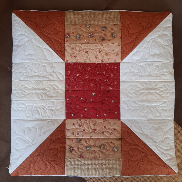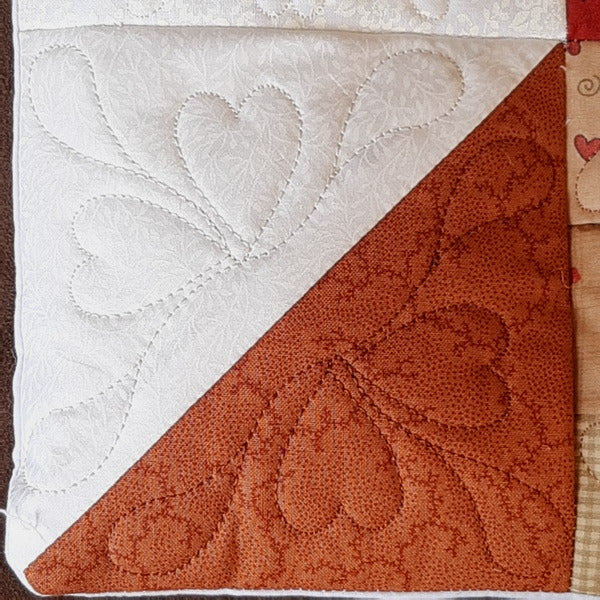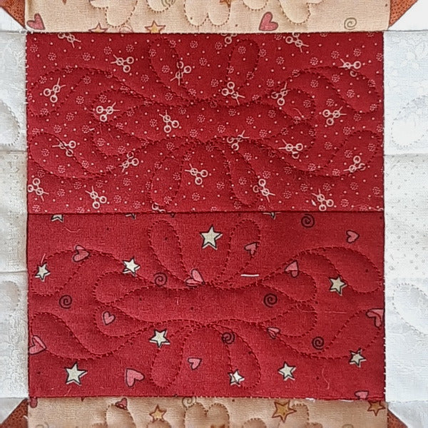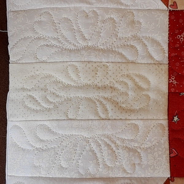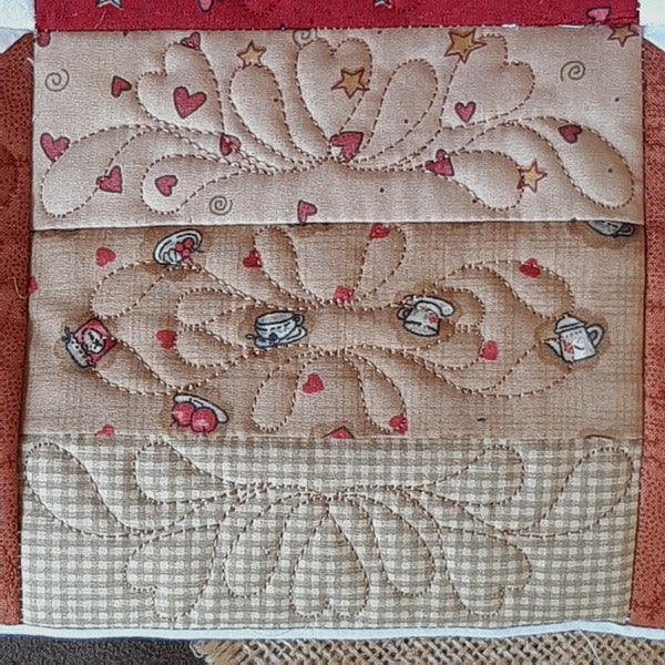 The IHQ Country Cotton Spool Panel consists of 3 design pieces. These are used to make up the 9 block panel. Each design piece is completed, including the quilting, in the hoop.