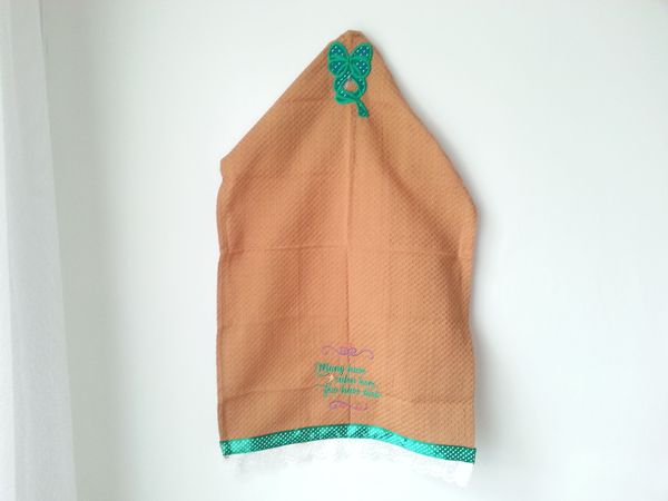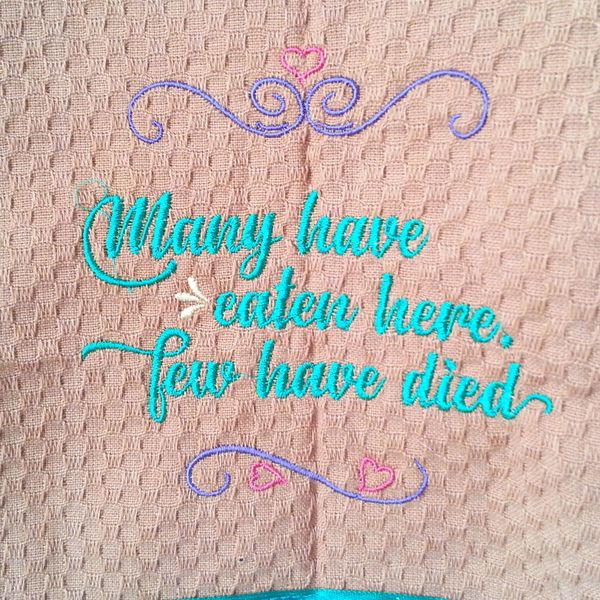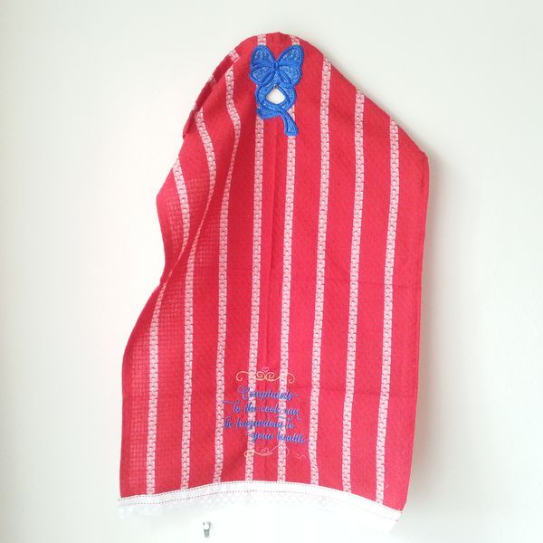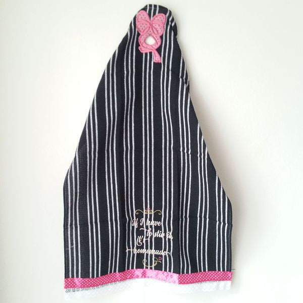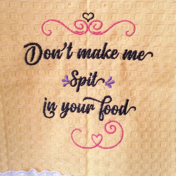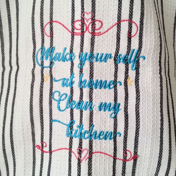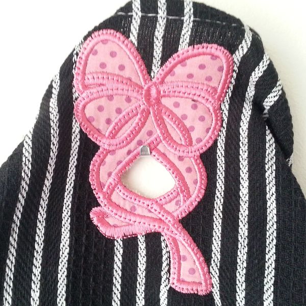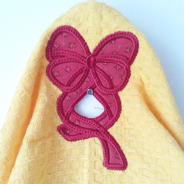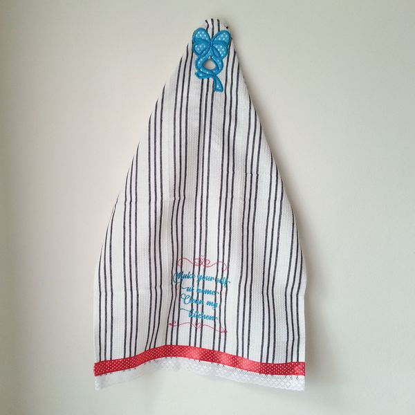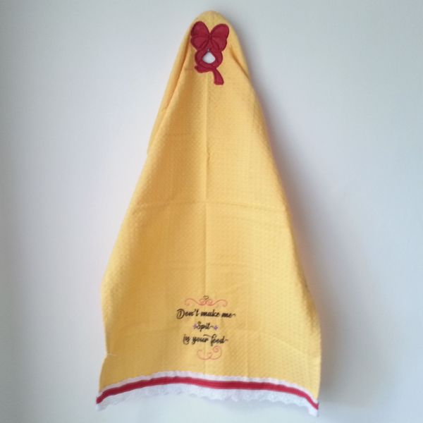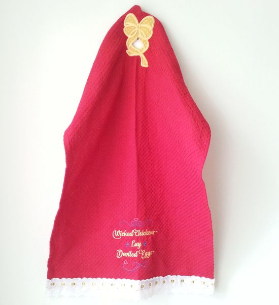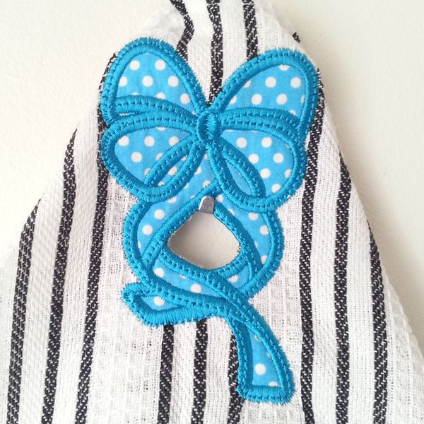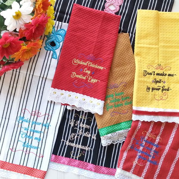 Show your sass with these fun sassy dishtowels saying and cute ribbon applique hanger. The Hanger is done in applique while the sayings are all embroidered. Use thread colors to match or contrast your dish towels. These sassy dishtowels make for great gifts or to sell the dish towels at craft stores. They would also make for a fun "bride to be" gift.