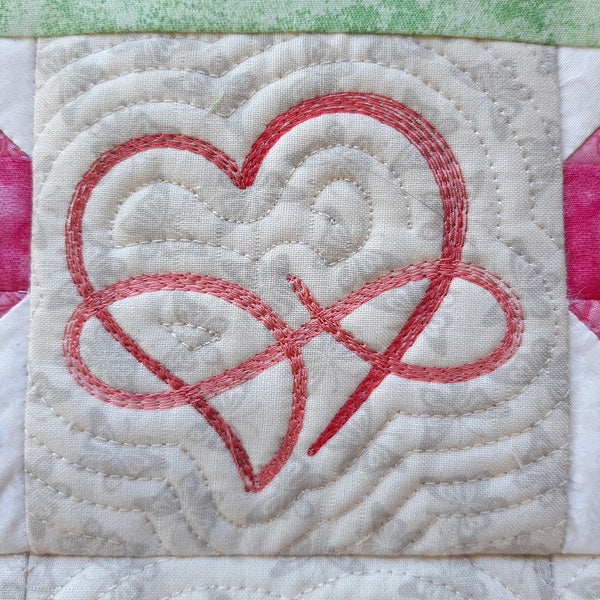 abundantly and freely. This Infinite Love Mini Quilt is made in 12 blocks. Six blocks are made with an embroidered infinity heart in