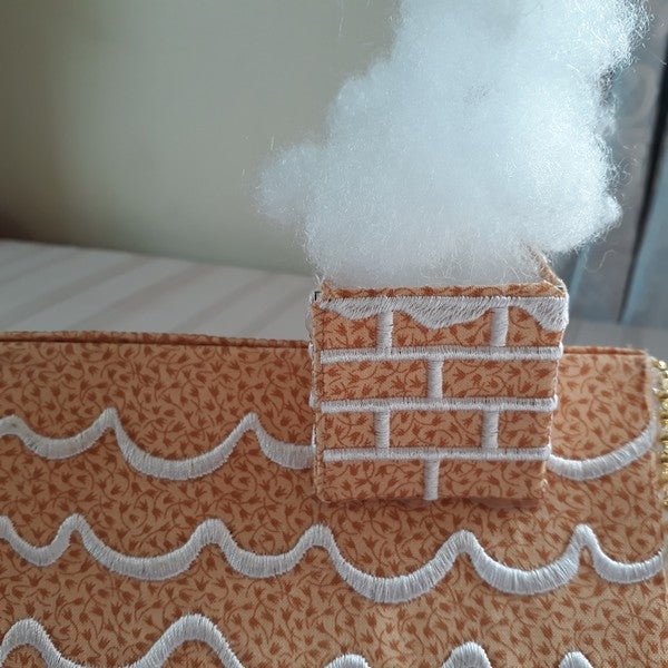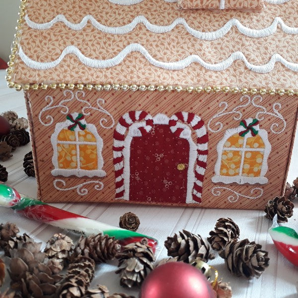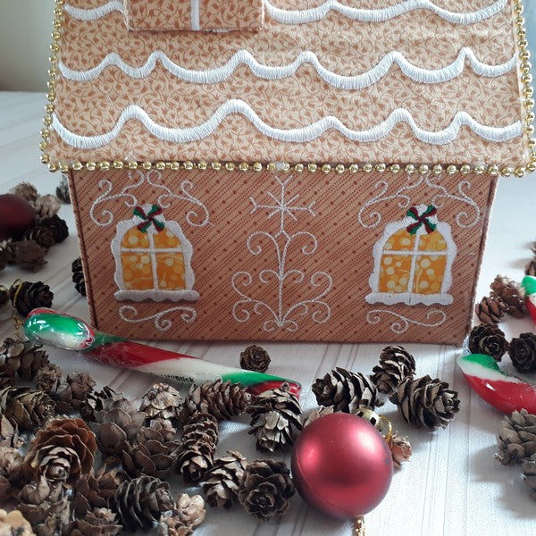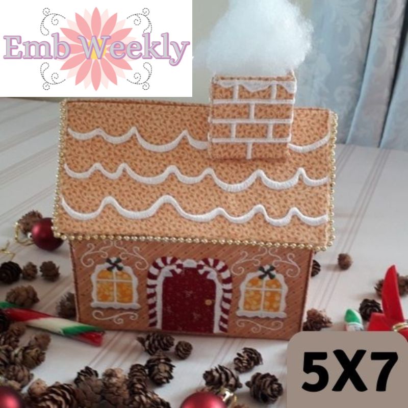 YUM…Gingerbread Houses are the favorite walk past snack décor to have at Christmas. This little Gingerbread House is a fun little craft project to make for the table, unfortunately it is just not edible. The Gingerbread House is made using a 5x7 hoop. Finished size is 7” wide by 5” deep by 7” tall.