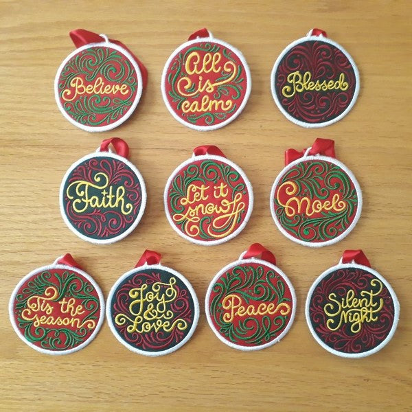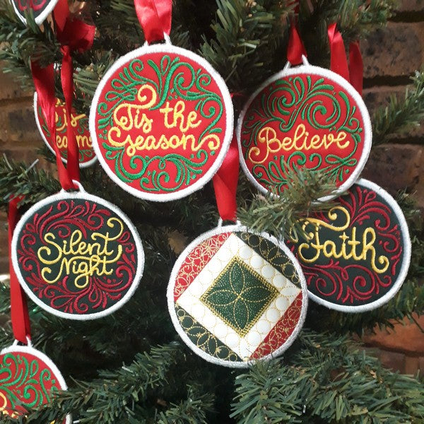 It’s always touching to decorate one’s Christmas tree with personal ornaments. This year add something different with these 10 quilted and embroidered ornaments. They are double sided and easy to make in a day with small pieces of fabric. The Quilted Christmas Ornaments are made In-The-Hoop and are for the 4x4 hoop.