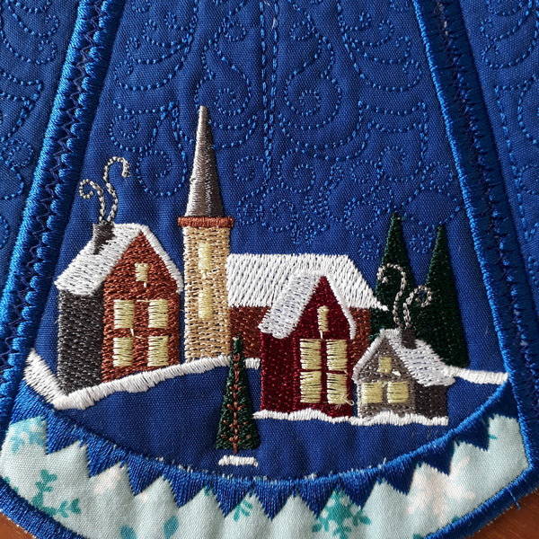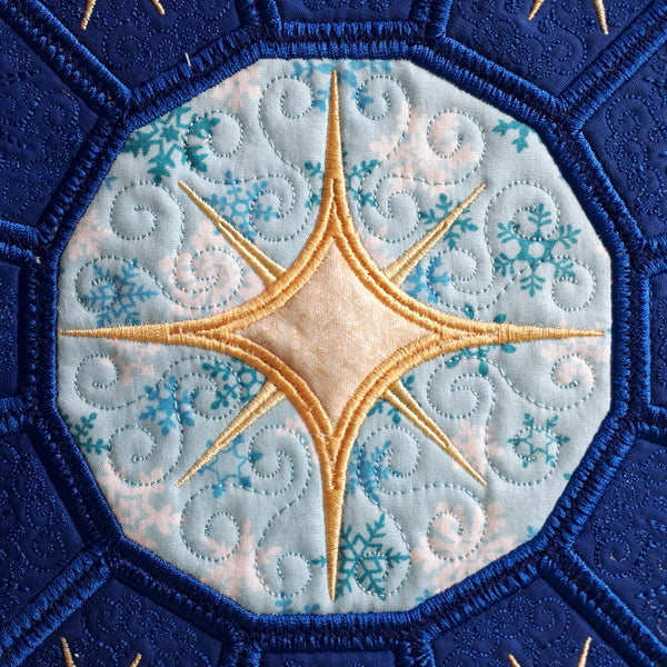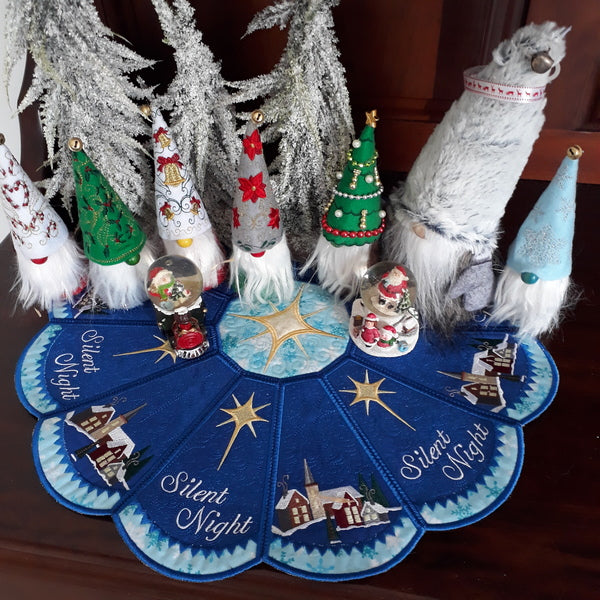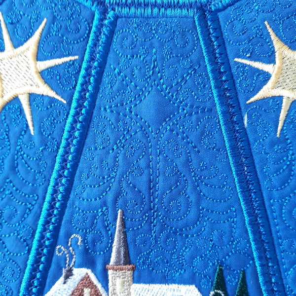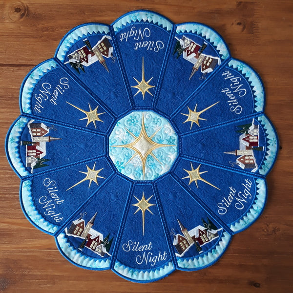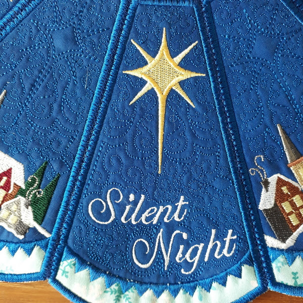 The Silent Night Table Topper is a gorgeous and ornately detailed table topper for displaying Christmas decorations or as a table topper. Each piece is made complete and lined in the hoop and finished by sewing the panels together.