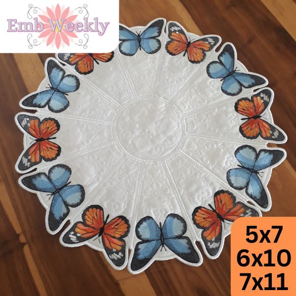 Celebrate spring with this gorgeous butterfly table topper. Perfect as a placemat in the 5x7 set or as a table topper in the 6x10 or 7x11 sizes. Lovely for tea time, side tables with a stained glass lamp or even as part of bedroom decor.