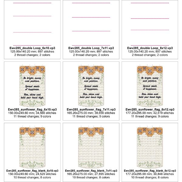 Sunflowers are always a welcome theme especially for Fall designs, This sets consists of a Sunflower Garden Flag, 1 flag with a saying and a blank flag each in 3 sizes.