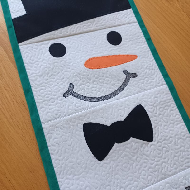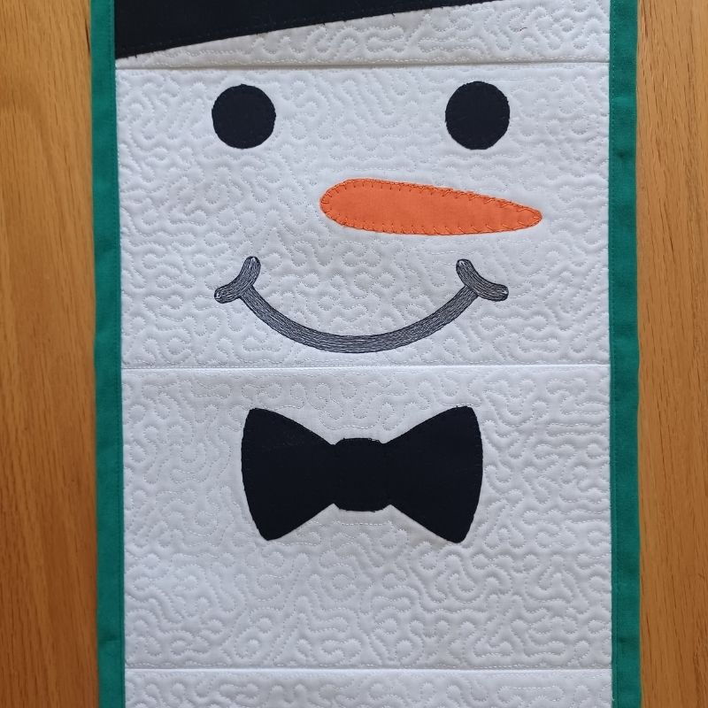 The fun of Christmas in one hanger, Let It Snow. Panels are made in the hoop. The applique method is super quick and easy to do with everything trimmed ITH. You will have your hanger ready in no time. The panels are joined together and the backing and binding is done with a sewing machine.